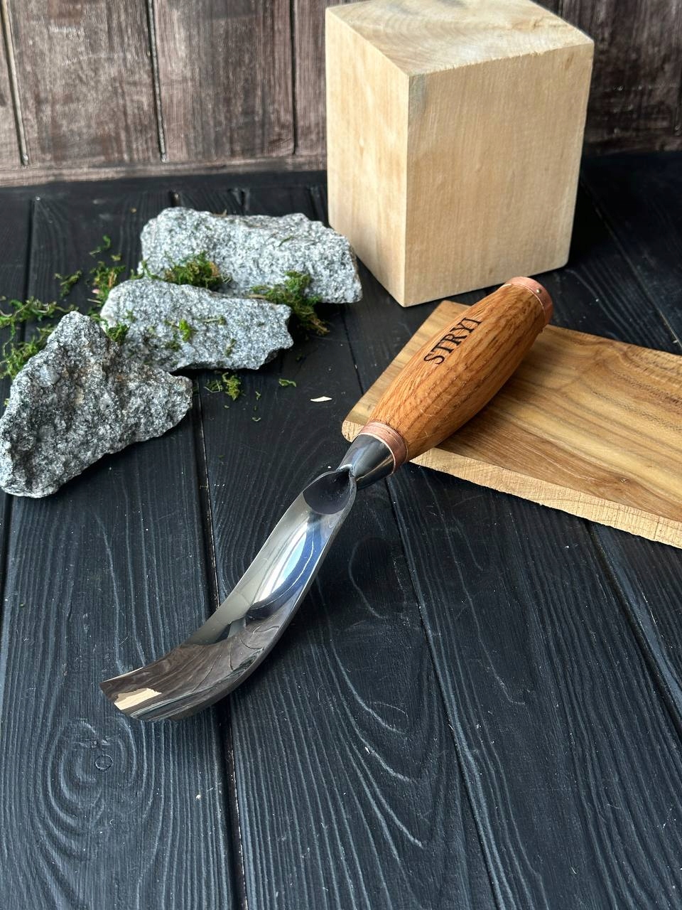 Мы представляем большое скульптурное зубило stryi с профилем 7 - прочный и точный инструмент, созданный для работы на больших деревянных поверхностях, таких как рельефы, фон скульптур, углубление сосудов и мисок. Благодаря изогнутому лезвию, оно позволяет создавать канавки среднего размера в древесине, обеспечивая при этом ликвидность и точность резки.