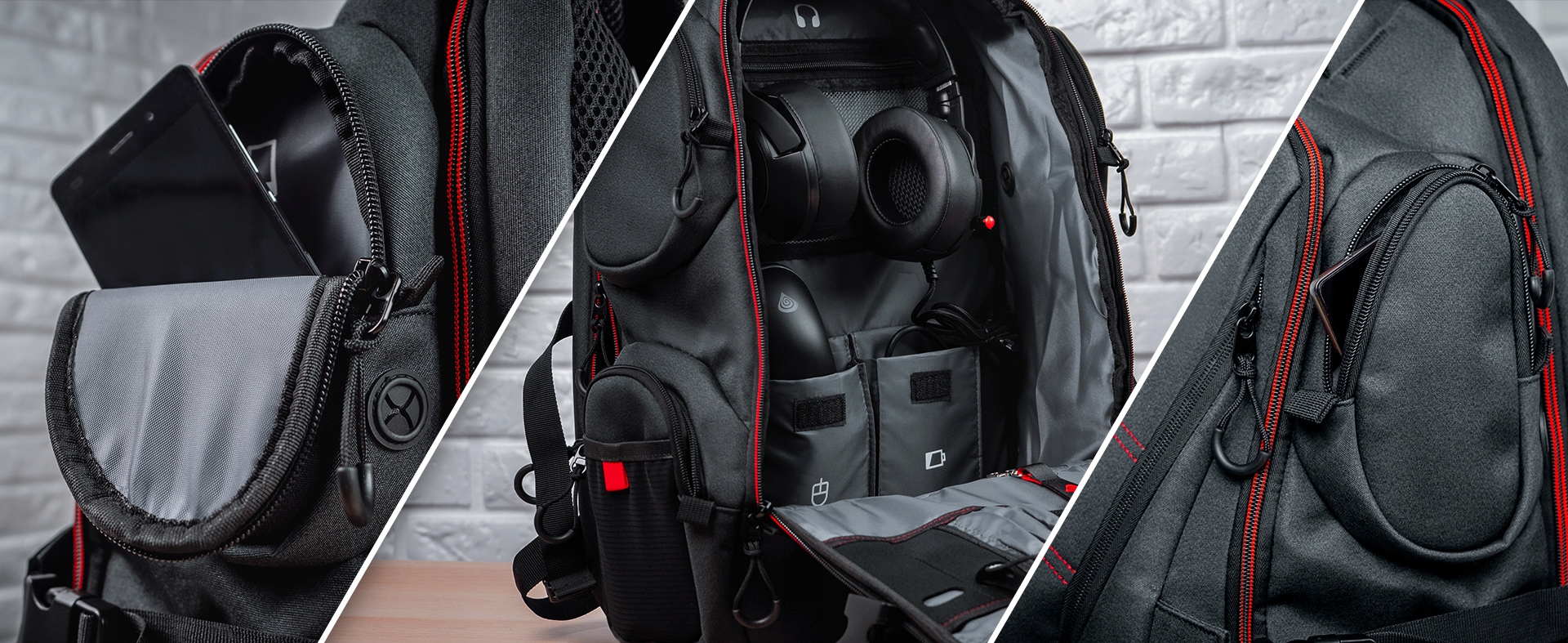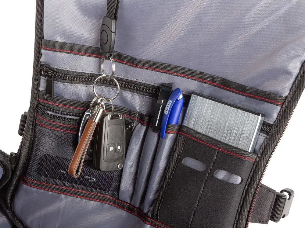 В основном отделении имеется множество специализированных карманов: для мыши, планшета, блока питания и различной периферии и наушников. На передней панели имеется органайзер для офисных принадлежностей, ключей или флешек.