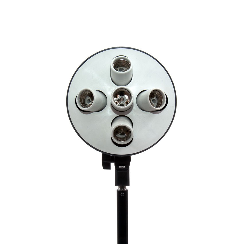 В комплект входит кабель питания. Устройство имеет предохранитель. Софтбокс рассчитан на работу с пятью лампочками максимальной мощностью 85 Вт каждая. Комплект крепится к осветительным стойкам с помощью встроенной ручки, позволяющей произвольно регулировать угол наклона.