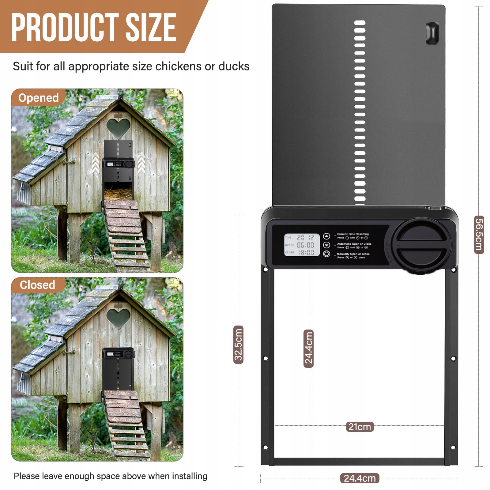 【Точный режим времени】 Наш продукт использует точный режим таймера, чтобы обеспечить надежное действие в любых погодных условиях, без противоречивых датчиков света, которые могут привести к случайному открытию или закрытию двери из -за изменения условий освещения. Таким образом, мы гарантируем простое и эффективное действие. Это обеспечивает комфорт и точность обслуживания и устраняет всю неопределенность. Куриная дверь ок. 24,4 x 32,8 см (ширина x высота), а размер отверстия составляет около 20,4 х 25 см (ширина x высота). Который может быть адаптирован практически к любому размеру курицы, и утки могут легко пойти.
