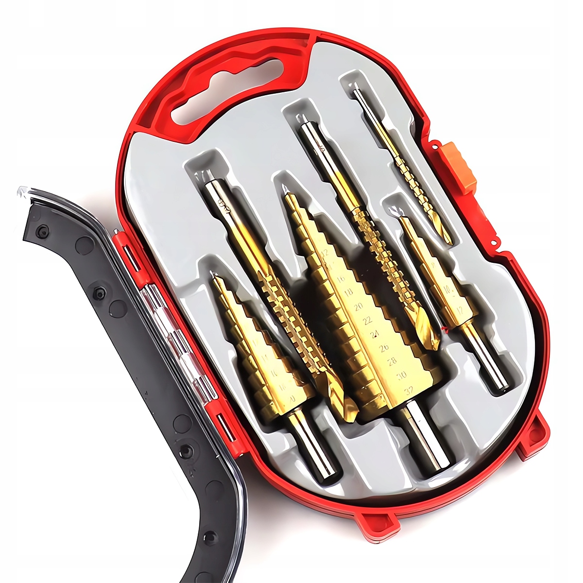 В комплект входят ступенчатые сверла, охватывающие диапазоны 4–12 мм, 4–20 мм и 4–32 мм.