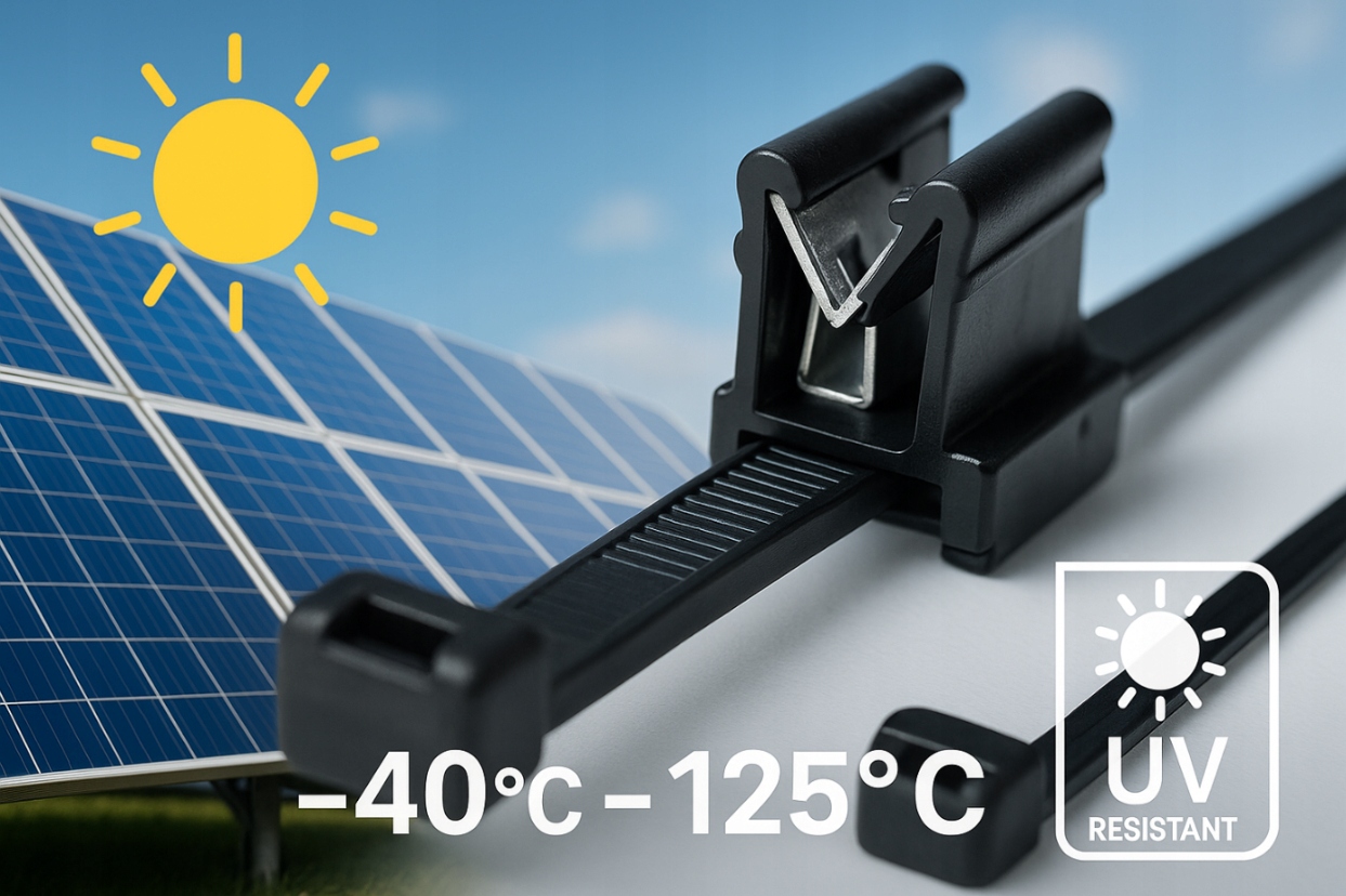 Материал PA66, устойчивый к УФ-излучению, влаге и высоким температурам, делает галстуки идеальными для использования на открытом воздухе. Это практичный фотоэлектрический аксессуар для прокладки кабелей постоянного/переменного тока на панелях, кабельных трассах, корпусах и элементах несущих конструкций.