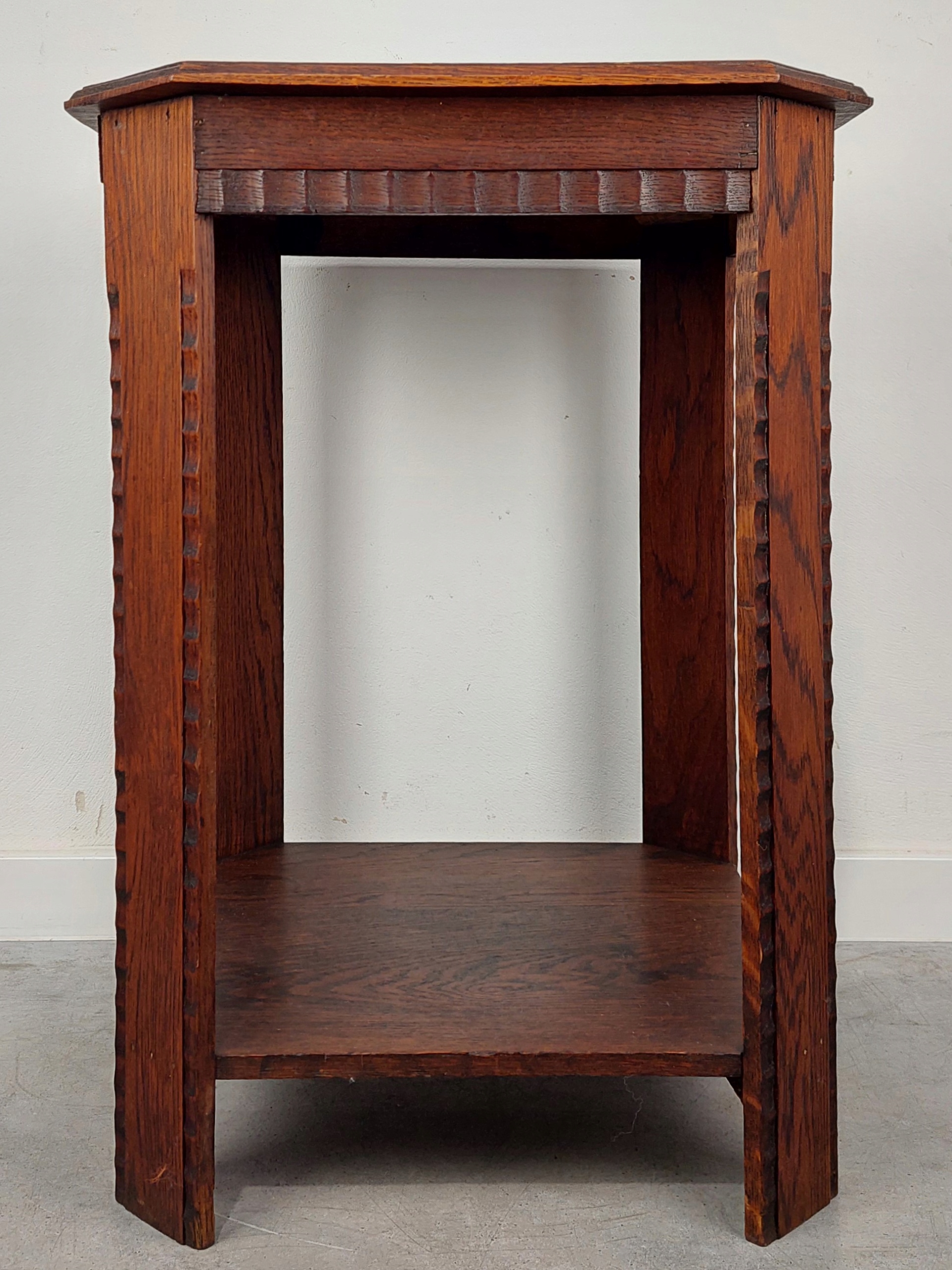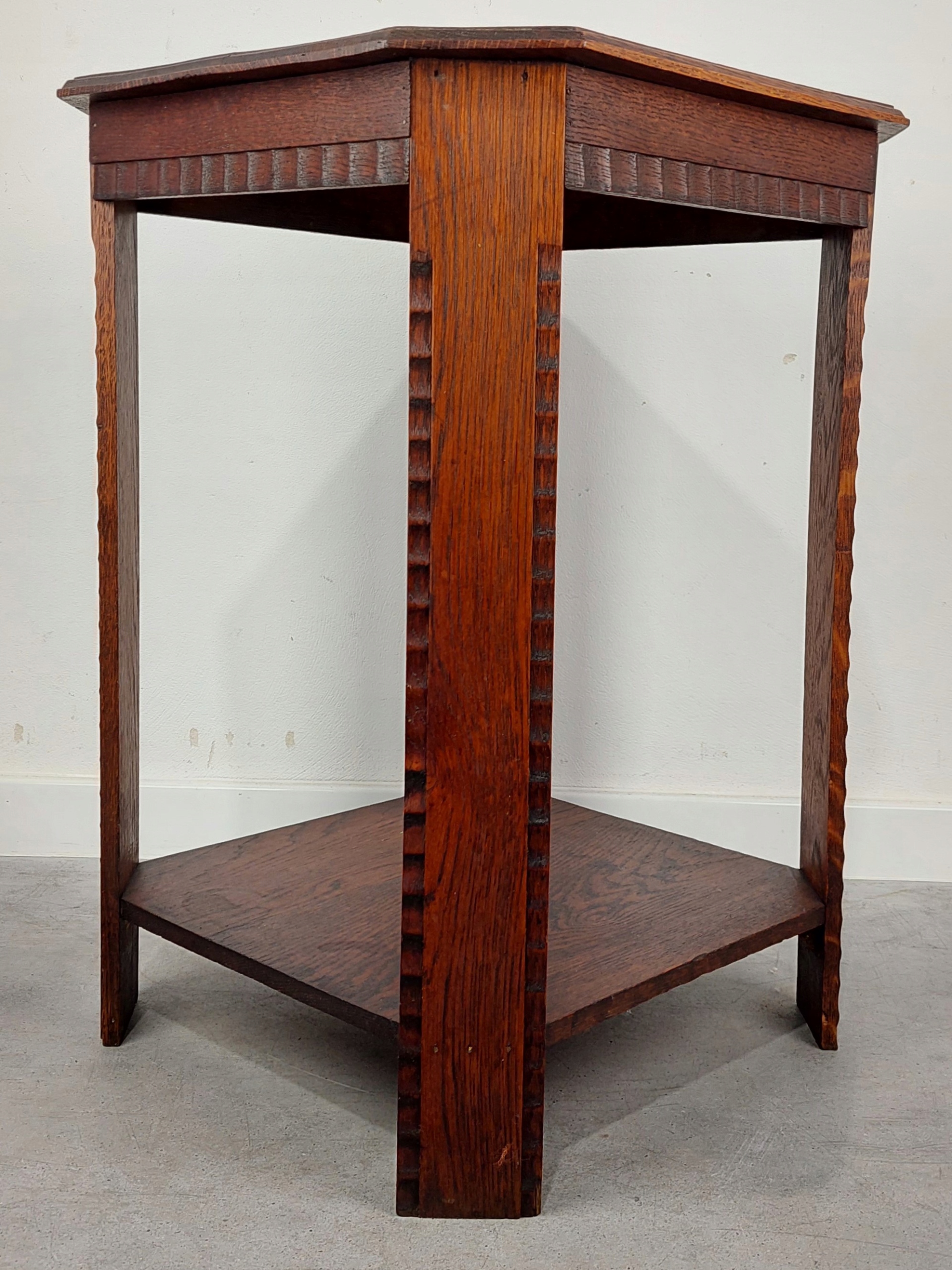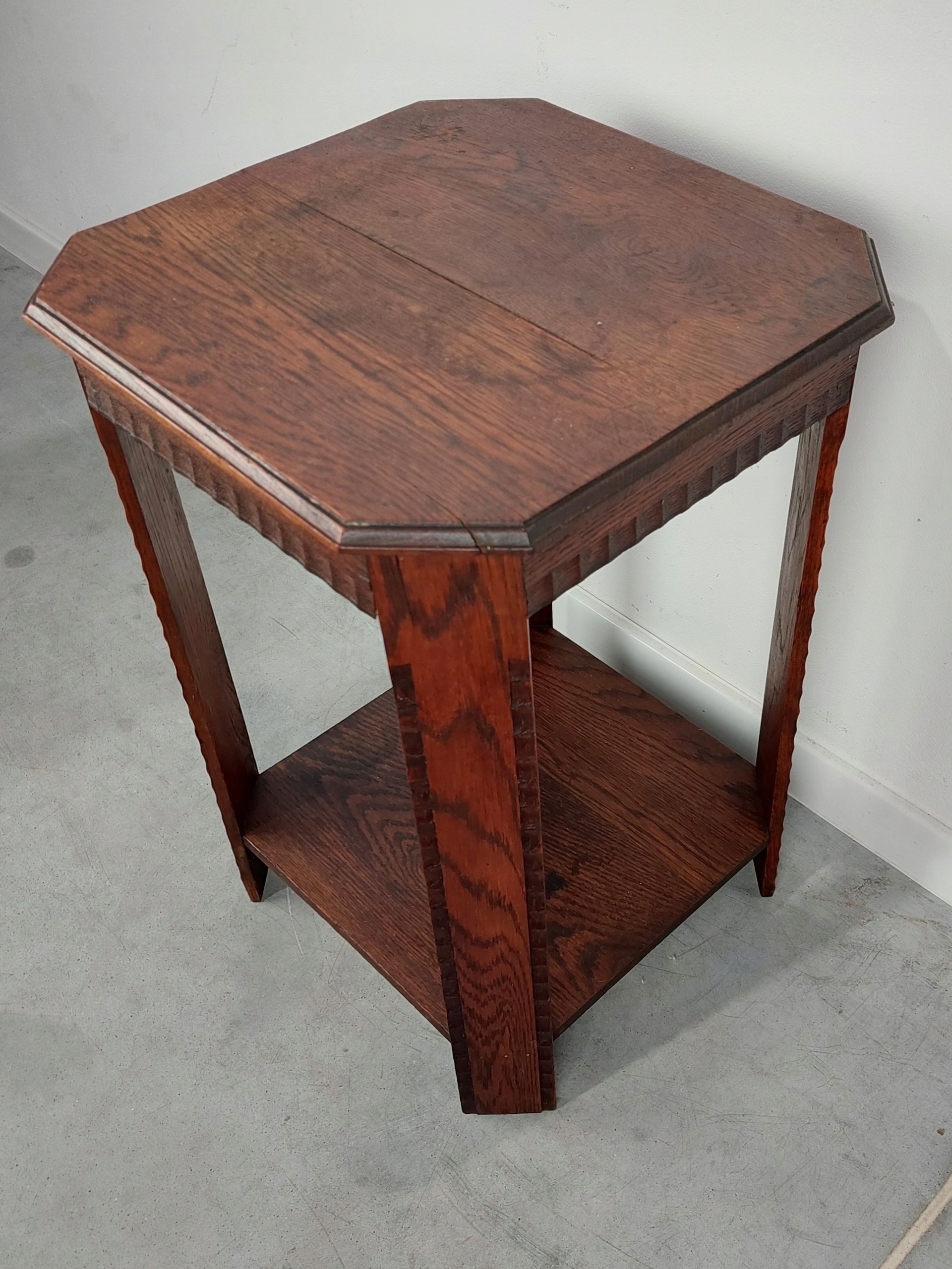 Стильная дубовая подставка для цветов в стиле ар-деко, двухуровневая. Есть царапины от использования, изменения цвета и естественное высыхание. Мебель устойчивая и жесткая, верх немного покоробился. (Цвета могут отличаться в зависимости от настроек графики) Все детали показаны на фотографиях ниже.