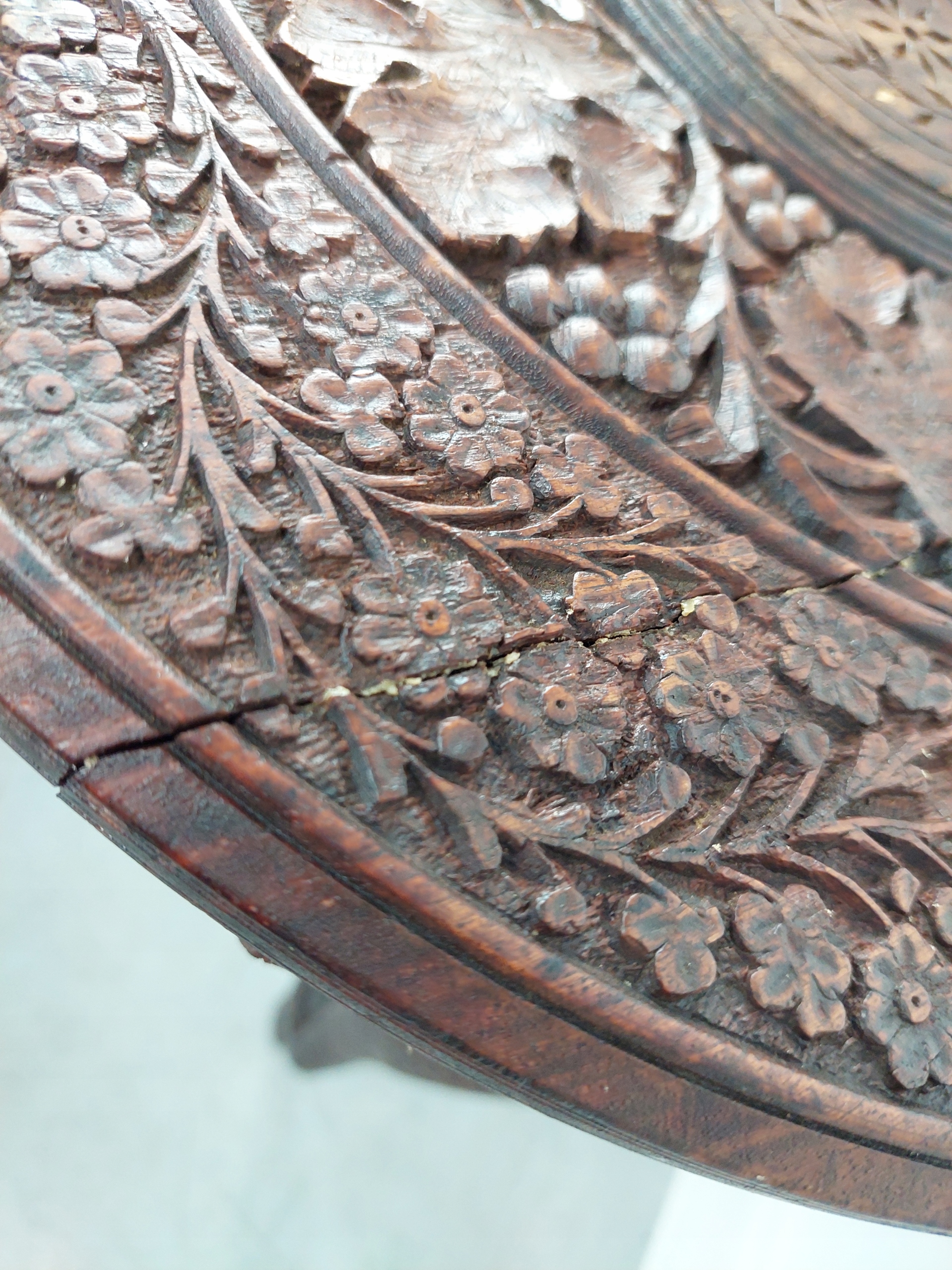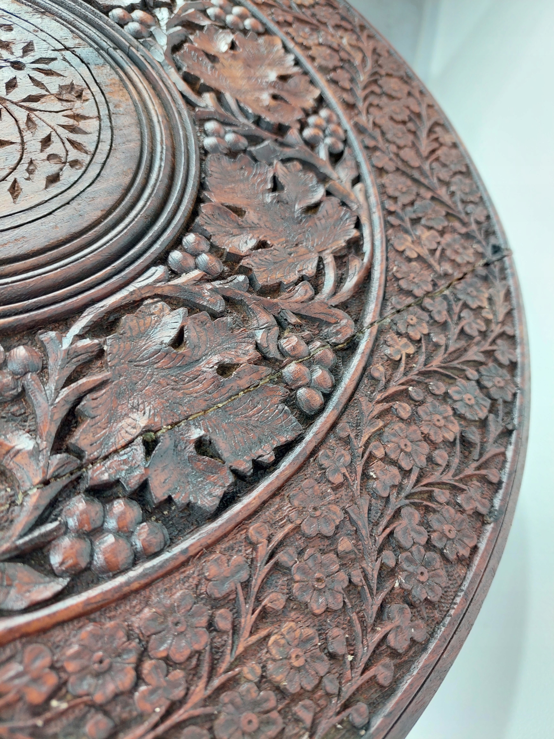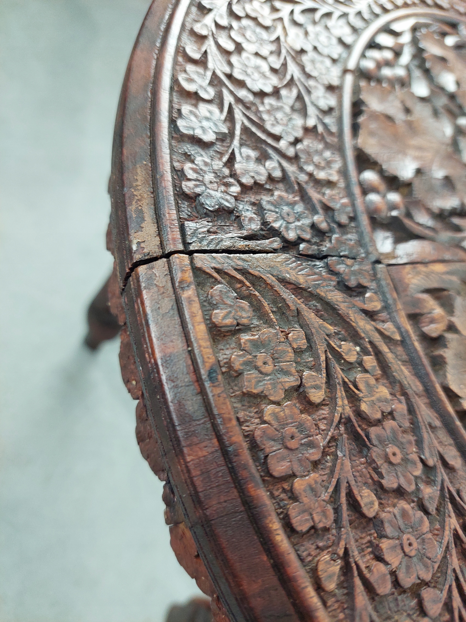 Стильный стол - восточный, подставка для индийских цветов. Красиво замысловатой резьбы, установлено на трех ножках в форме голов слона. На мебели видны следы использования, но нельзя отрицать, что она очаровательна и уникальна. Подробности показаны на фотографиях ниже.