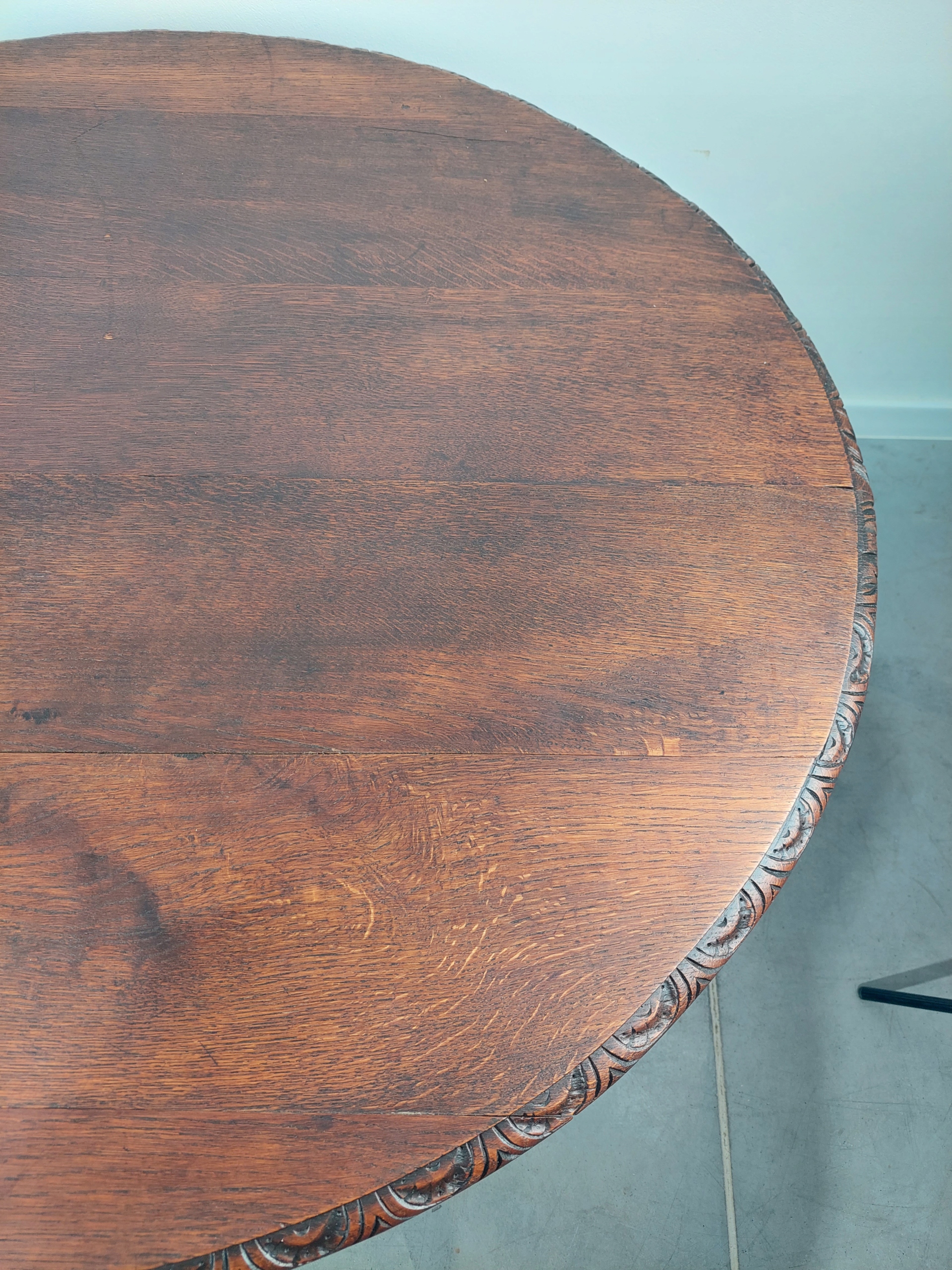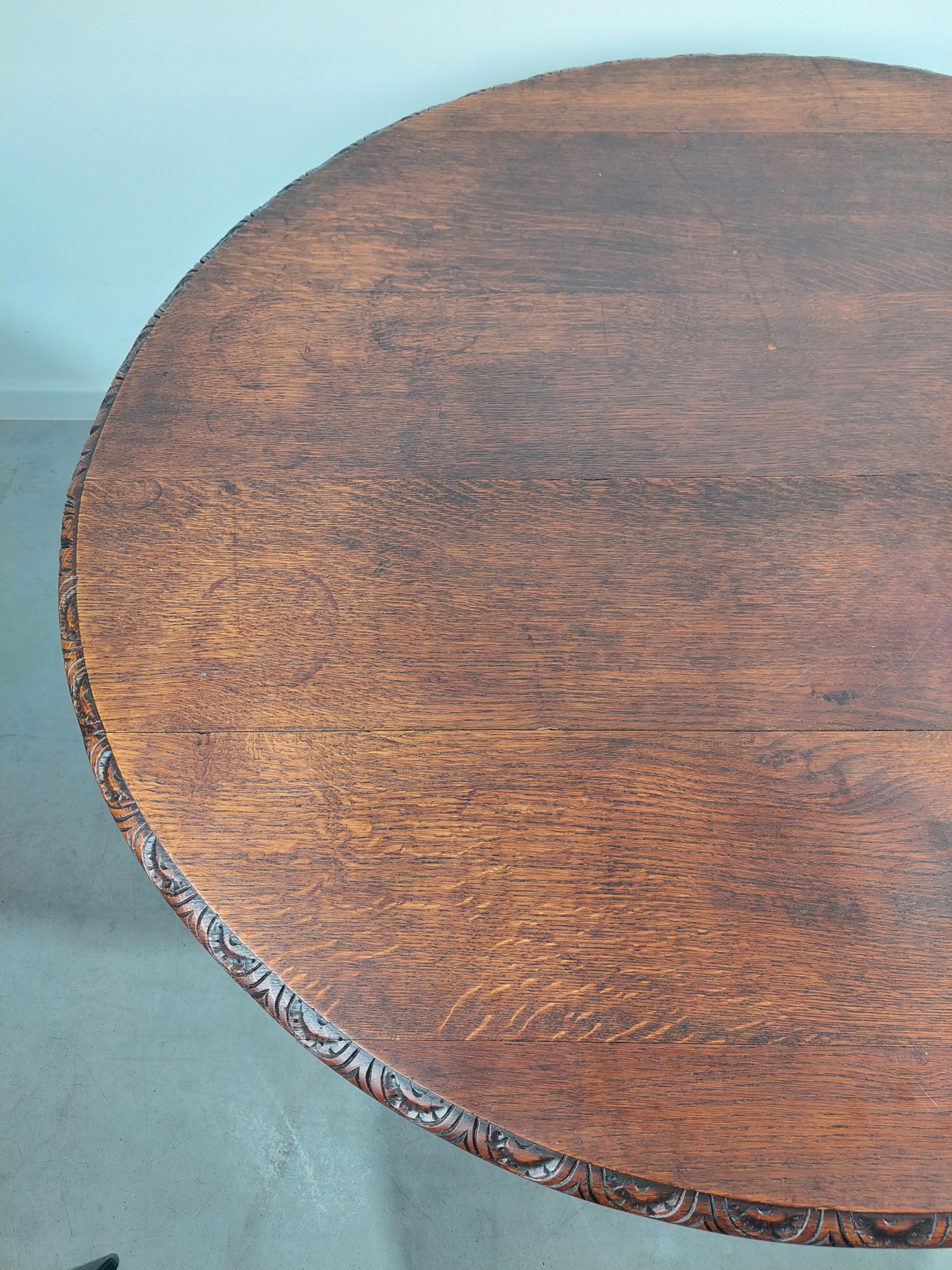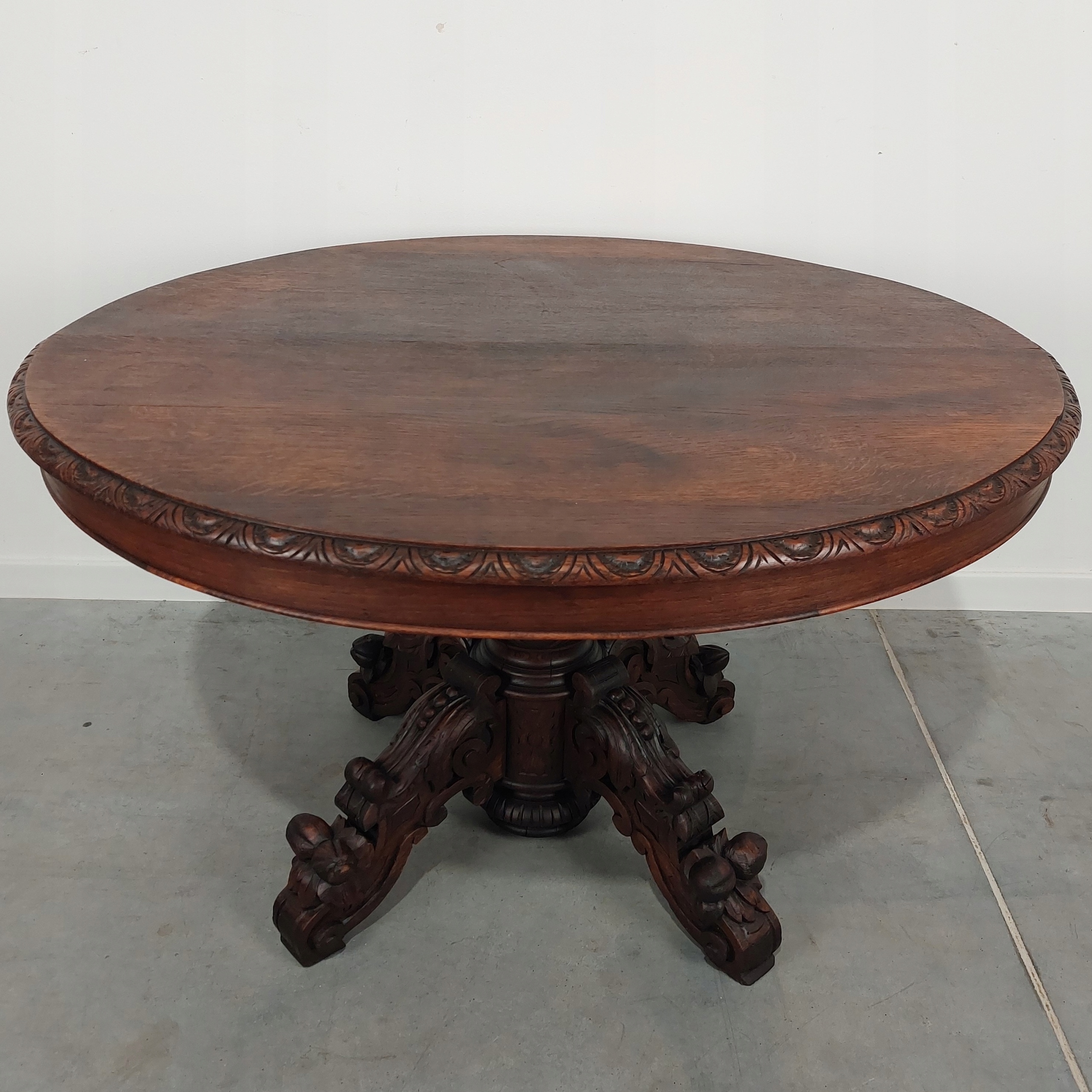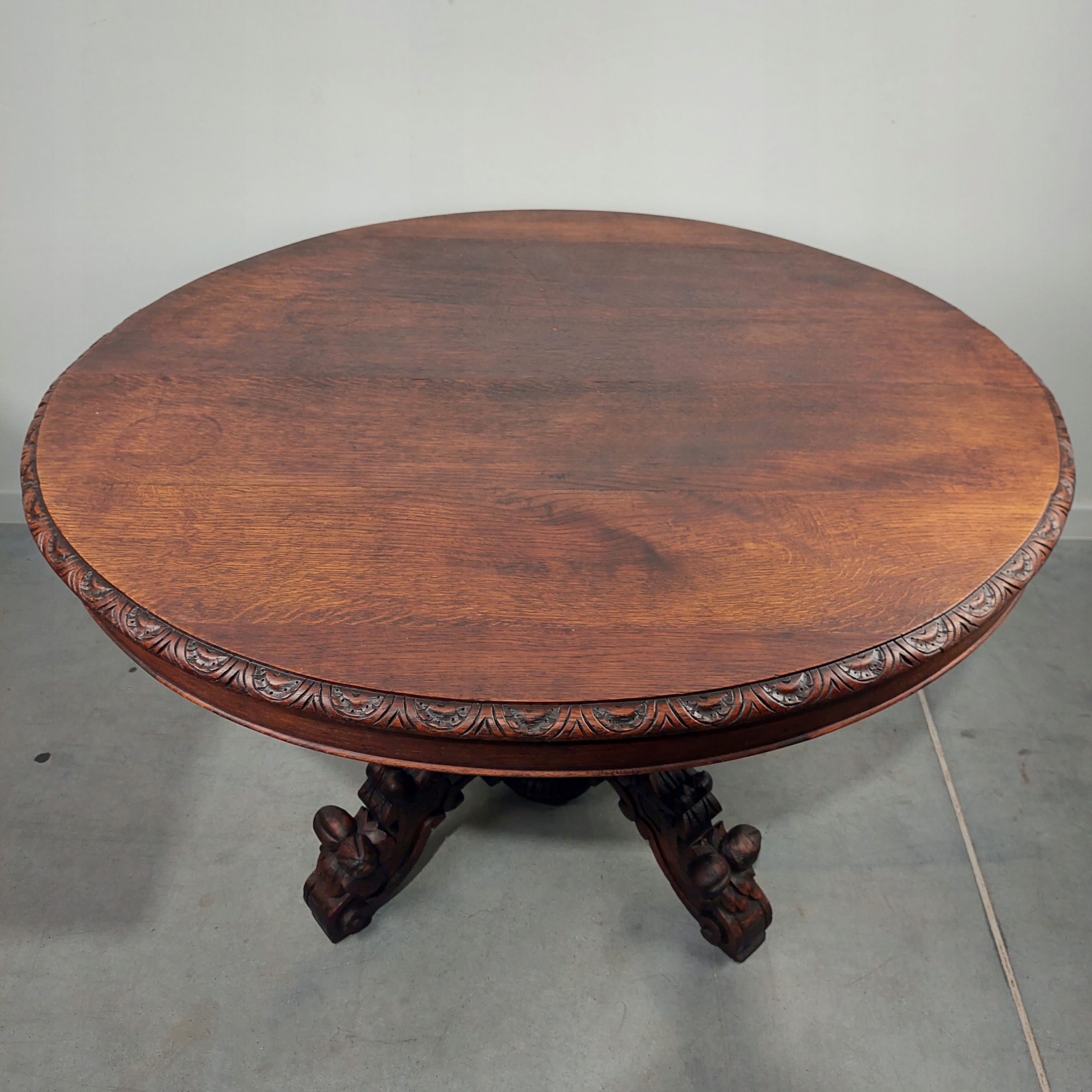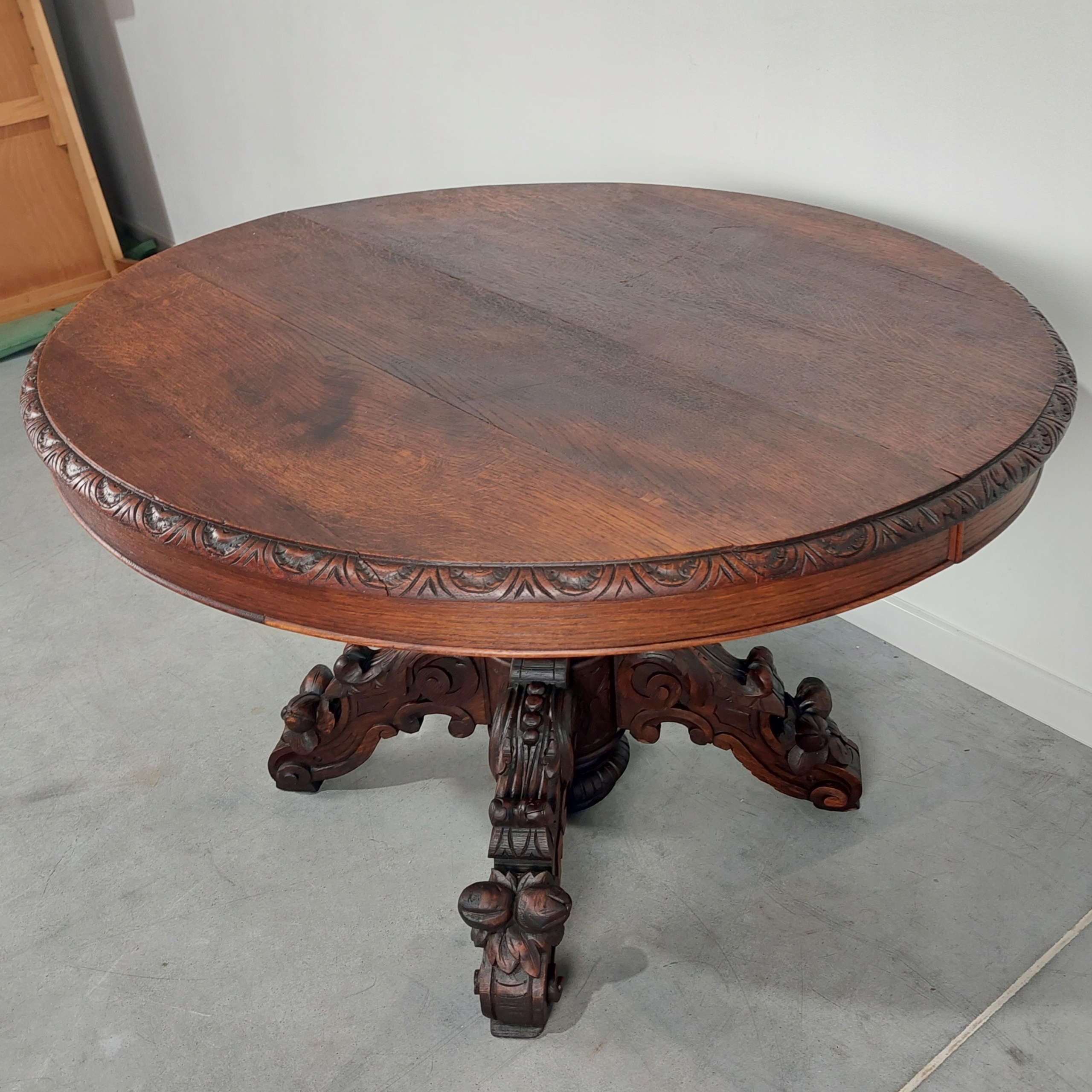 Стильный дубовый стол в стиле неоренессанс, установленный на красивой ножке с богатой резьбой. Все сделано из массива дуба. На столешнице имеются царапины/изменения цвета, а также естественное, типичное высыхание вдоль досок. Стол можно расширить, но вставок-расширителей у нас нет. Устойчивая и прочная мебель. Подробности на фотографиях ниже. (стол отправляется заказчику целиком).