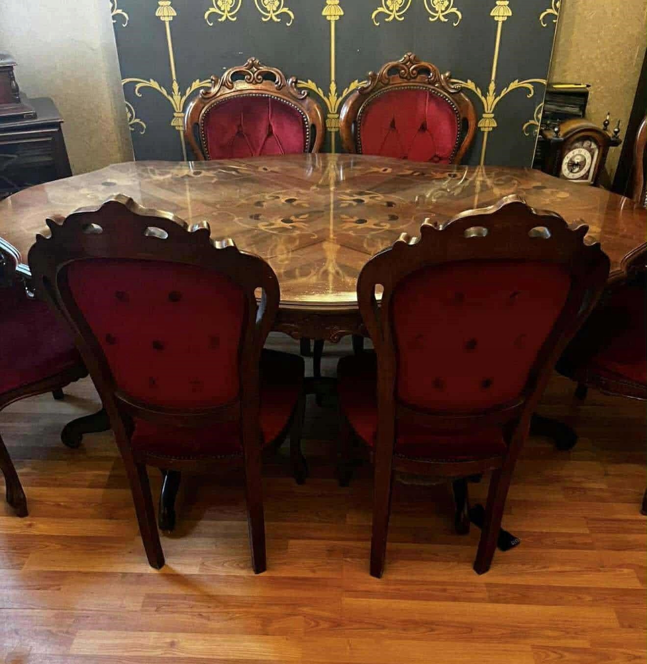 Массивный стол с красивой инкрустацией и шесть стульев со стегаными спинками, обитыми красным бархатом, создают комплект, который придаст шик любому интерьеру.