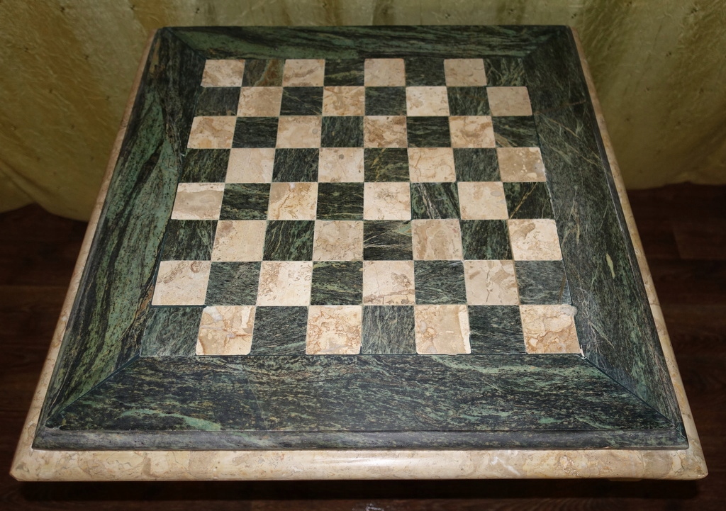 Предмет аукциона – шахматный стол из натурального мрамора. Стол устойчив, а также очень эффектен и репрезентативен и в то же время полезен для людей, которые любят играть в шахматы на террасе, в саду и т. д. Цвет мрамора – оттенки бежевого и зеленого с естественными прожилками.