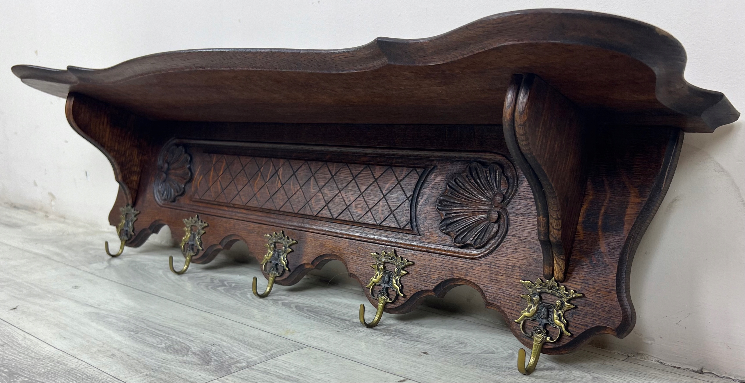 p>У него 5 латунных крючков. Сверху имеется полка.