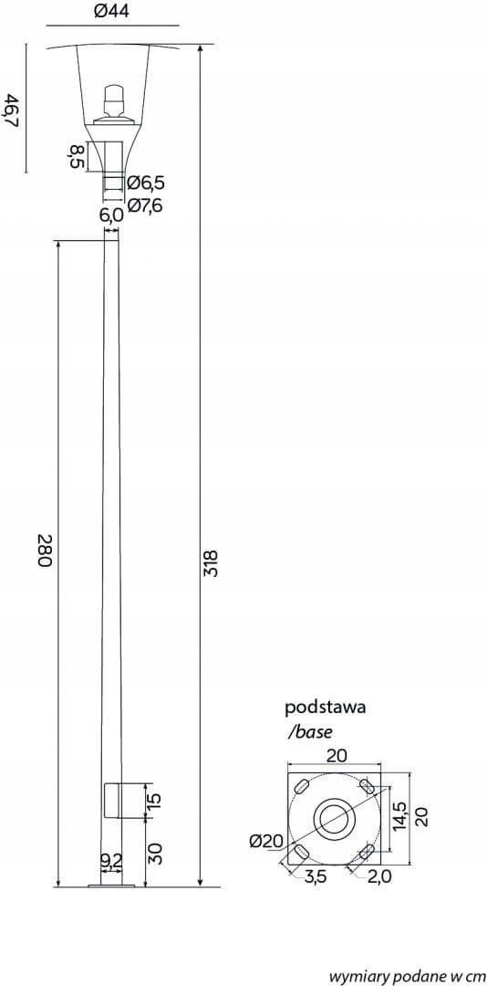 Высота самой головы составляет 46,7 см, общая высота фонарей составляет 318 см. Диаметр отверстия для мачты: FI65MM-76 мм.