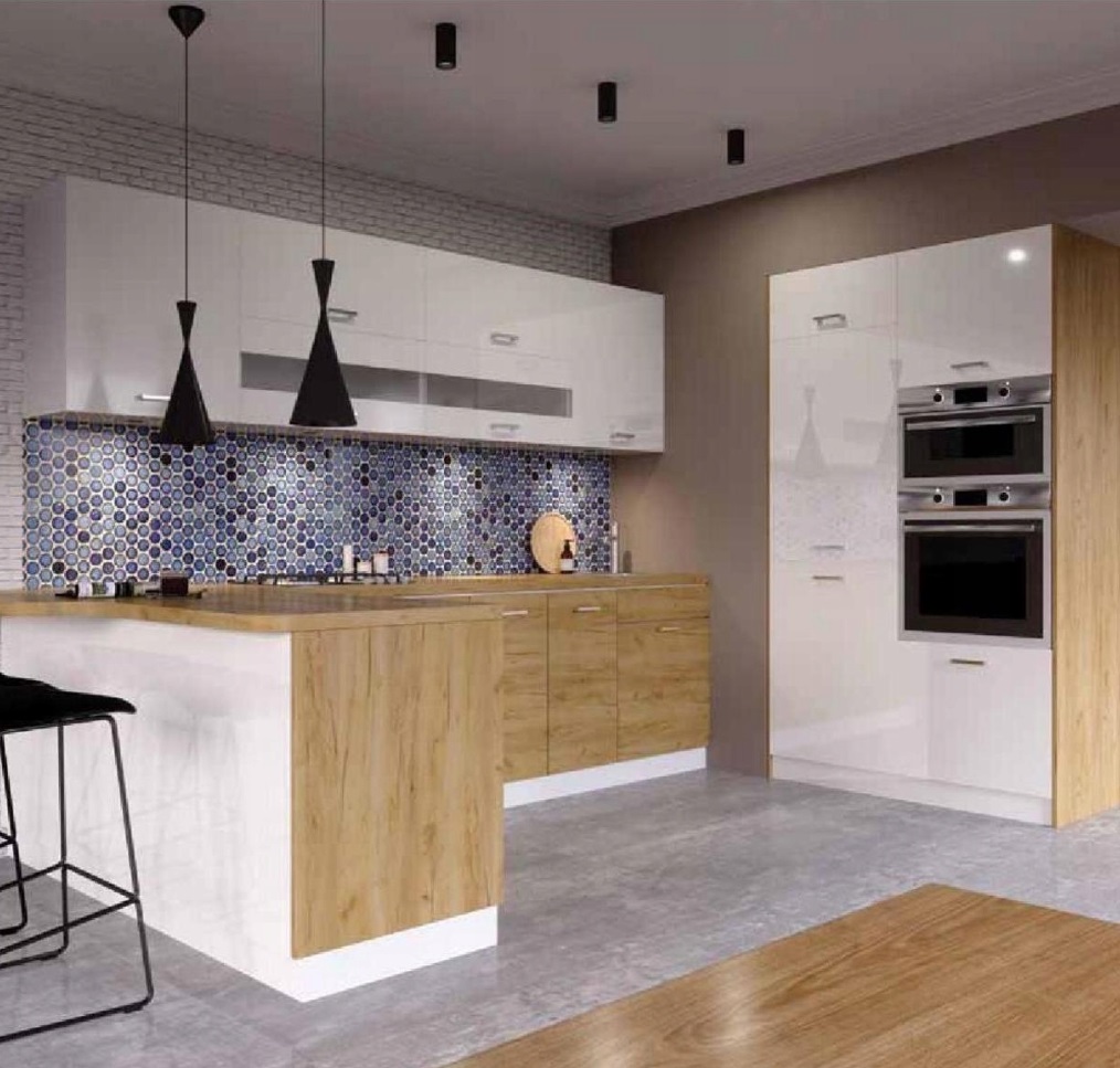 Что отличает эту кухню, так это современные ручки двух цветов, которые придают шкафам красивую линию, все это делает всю мебель очень современной и элегантной. Сочетая такую форму глянцевых белых фасадов с фасадами цвета дерева – крафт золотой дуб, мы можем визуально увеличить кухонное помещение, придав ему гармонию, элегантность и современный вид.