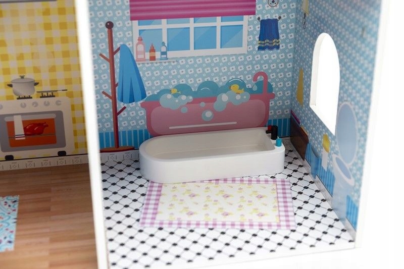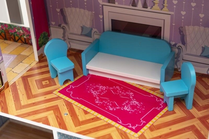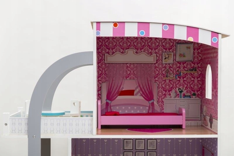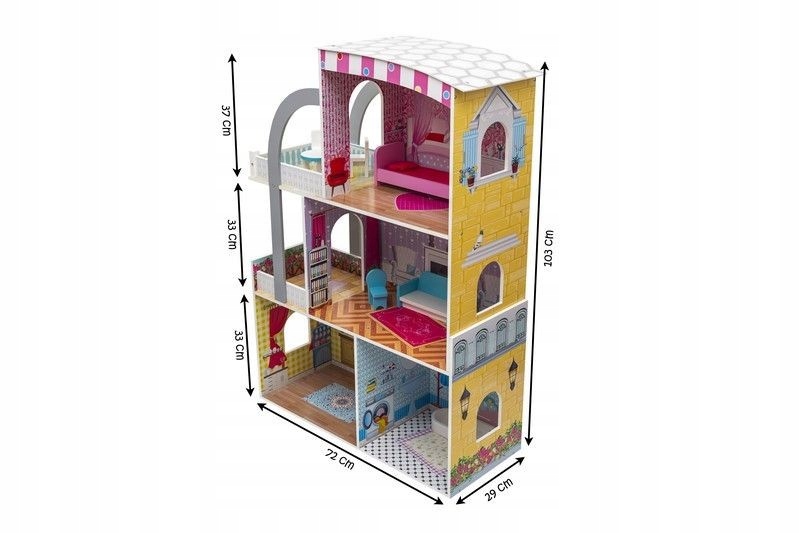 Современная роскошная кукольная вилла - это впечатляющая резиденция высотой 103 см и три этажа. Интерьеры включают спальню, гостиную, кухню и ванную комнату, а терраса и балкон обеспечивают дополнительное место для удовольствия. Сплошная деревянная конструкция и тщательно сделанная детали гарантируют долговечность и безопасность. Набор включает в себя набор мебели: кровать, диван, 4 стулья, стол и ванна. Благодаря ярким цветам и современному стилю, дом - это идеальный подарок, разрабатывающий воображение ребенка.