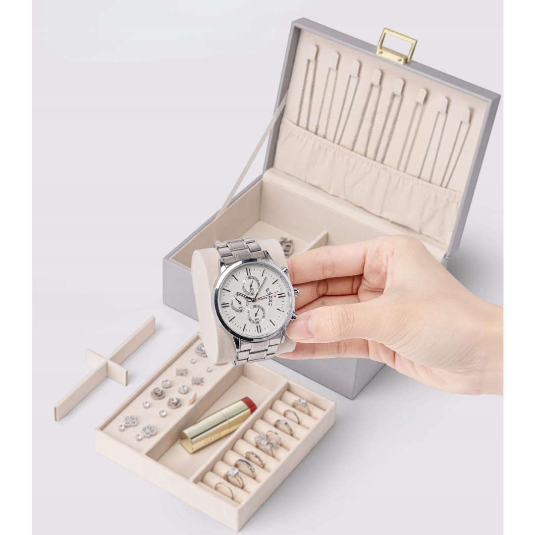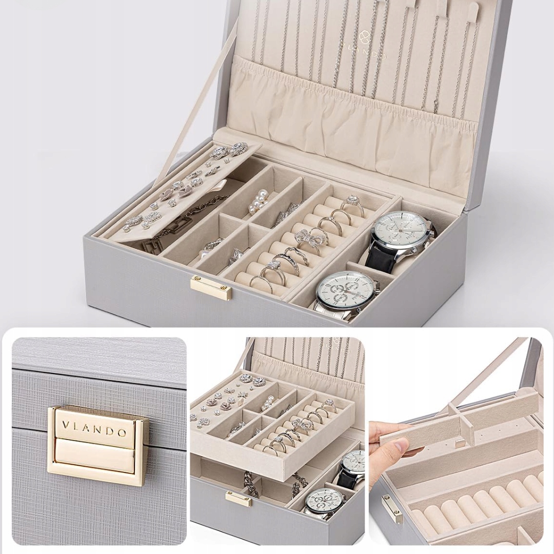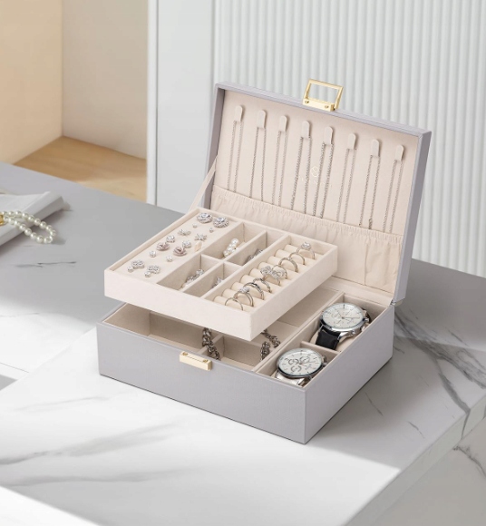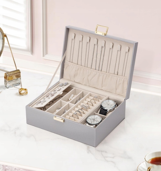 (Серый) Шкатулка для женщин и девочек, 2 уровня для хранения украшений, кожа, шкатулка с 2-мя подушечками для часов, органайзер для украшений, идея для подарка
