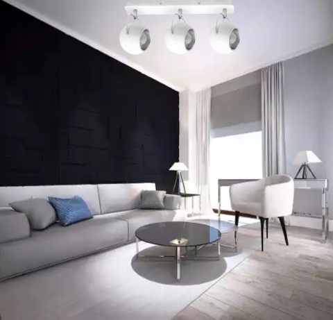 Металлическое хромированное основание белого цвета выглядит очень эстетично, и все это дополняется белыми металлическими абажурами круглой формы.
