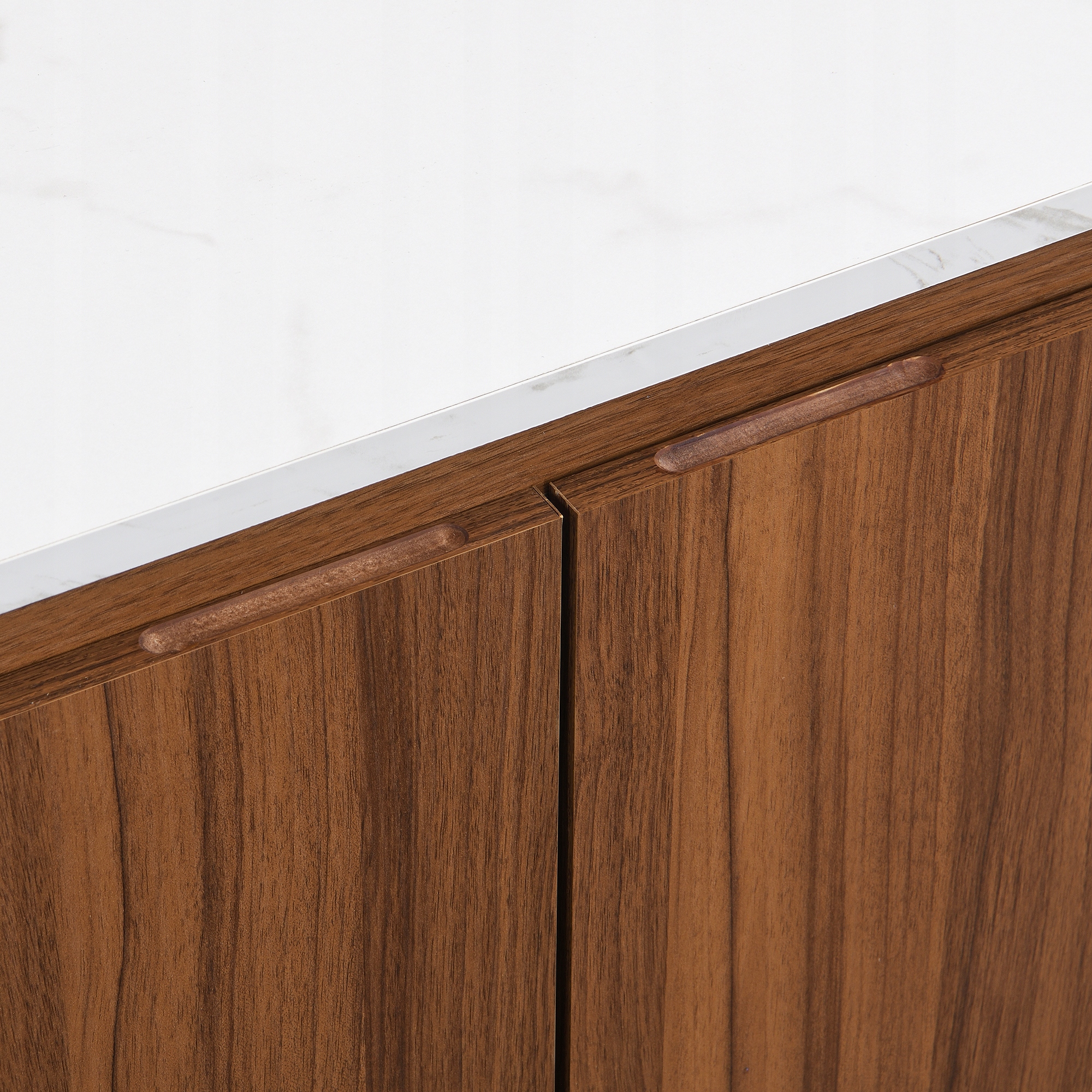 - Столешница буфета натурального цвета имеет мраморный вид, элегантна и легко чистится. Черная версия буфета имеет деревянную текстуру сверху, снаружи, на внутренних полках и дверных панелях, излучая естественное очарование. Вертикальные полосы с обеих сторон добавляют трехмерный эффект и современность. Уникальная форма идеально подходит для различных стилей дома.