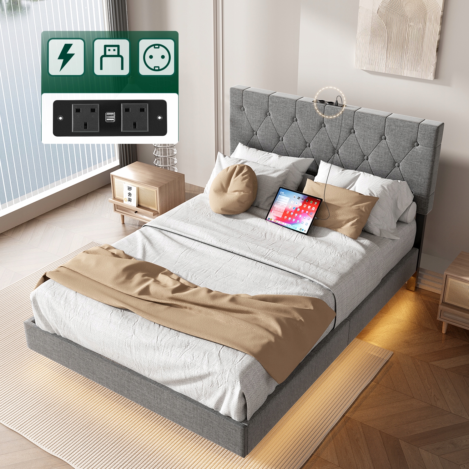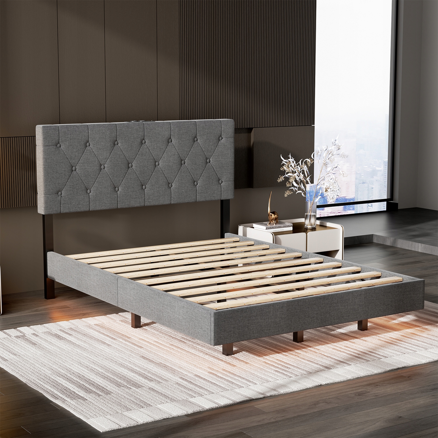 【Роскошный дизайн моды】 Современная обитая рама для кровати является элегантной и мягкой, красивой серой льняной обивкой без усилий, не смешиваясь в любом интерьере спальни.