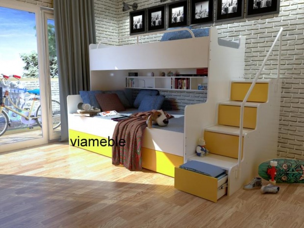 Продаю красивую современную двухъярусную кровать - 3-местную для детей и подростков в комплекте с матрасами - левая желтая (лестница слева)