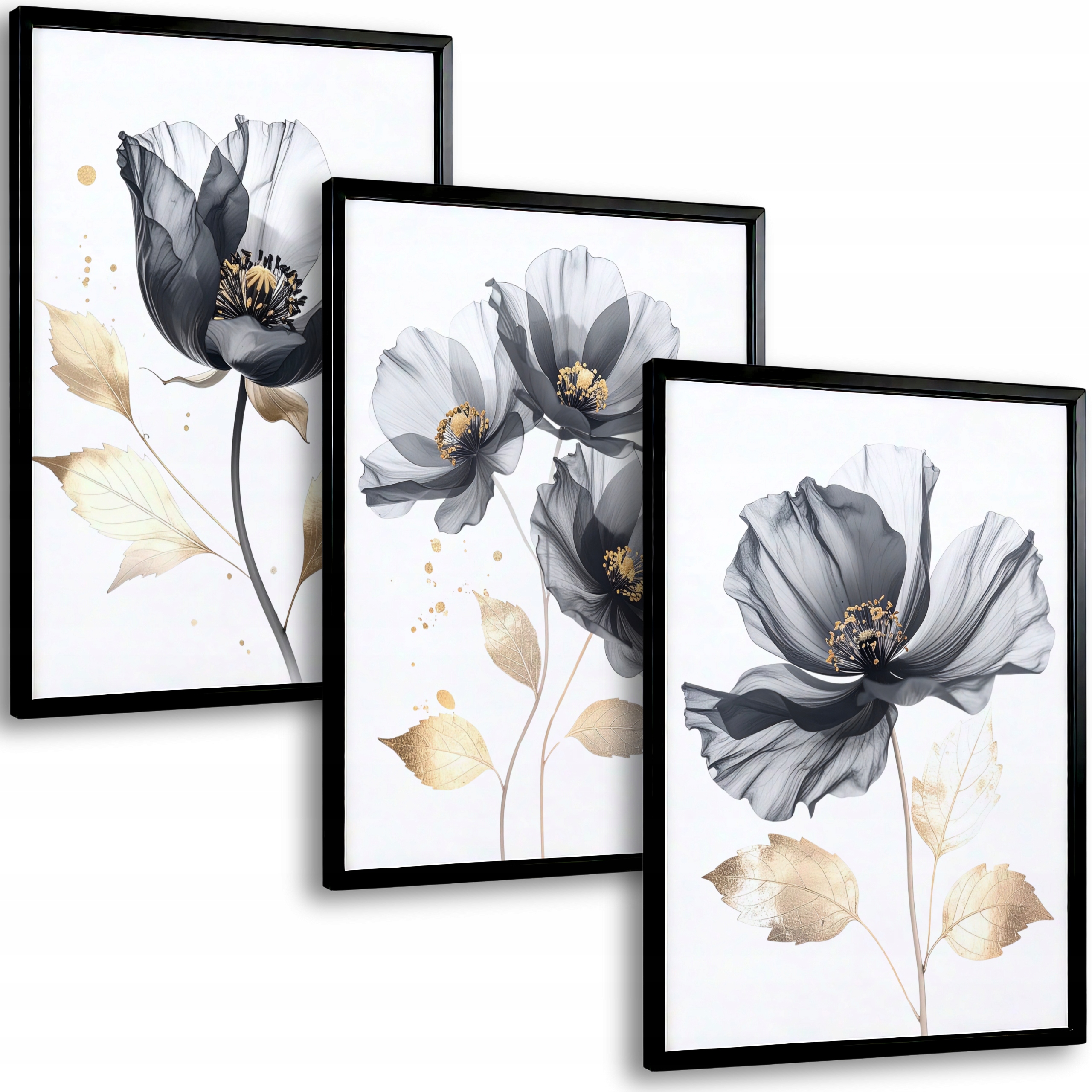 Современный набор из трех изображений, которые сочетают элегантность с простотой. Черные цветы на белом фоне с добавлением золотых листьев образуют выразительное, но приглушенное украшение. Это идеальный выбор для интерьеров, в котором подсчитывается стиль, последовательность и вечная эстетика.