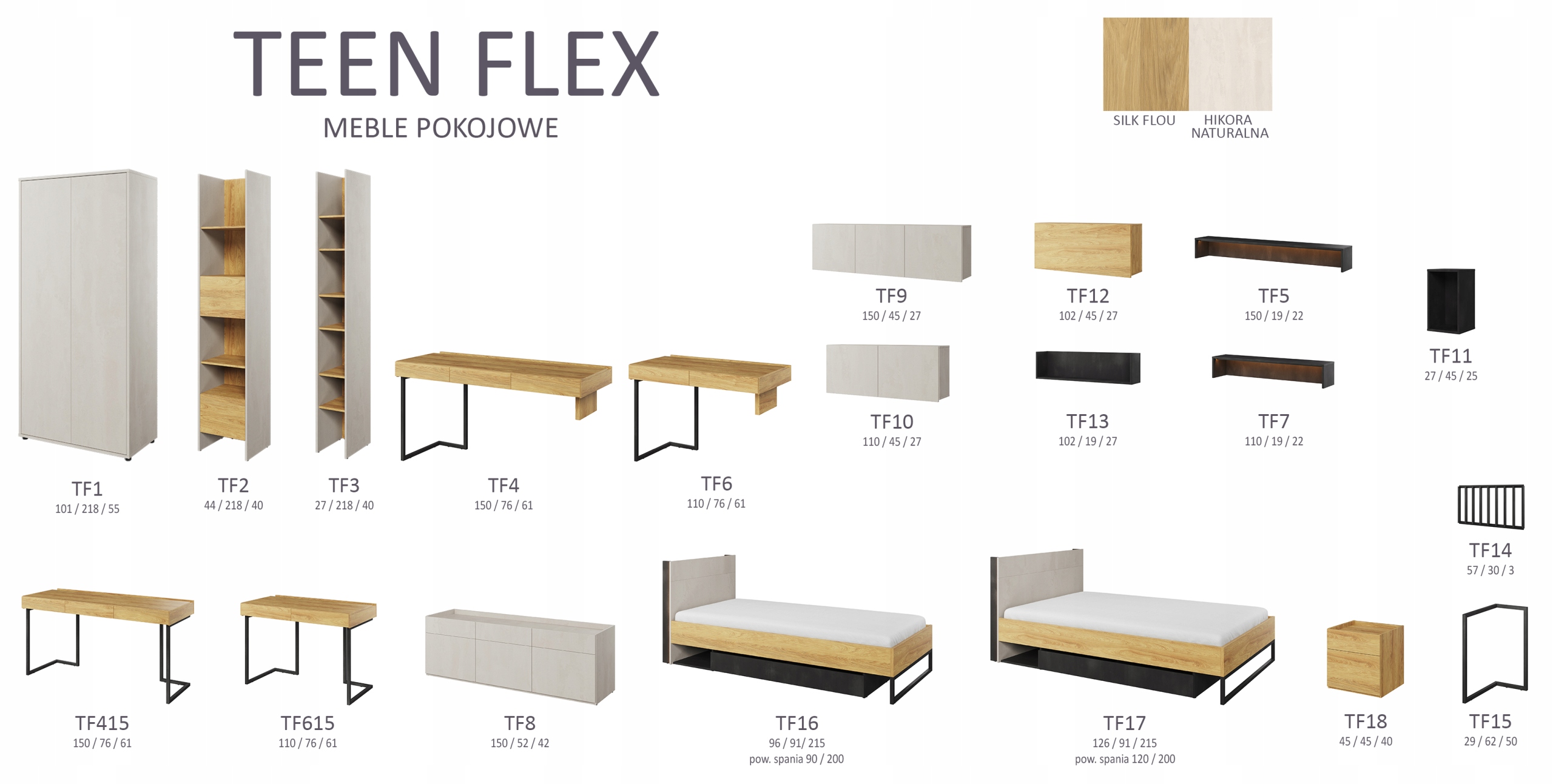 Teen Flex - чрезвычайно интересное предложение мебели для молодежной комнаты. Коллекция состоит из как отдельных блоков, но и из готовых наборов, которые вы можете успешно организовать, как комнату для девочек, так и мальчика. SET TFS8A был создан для братьев и сестер и состоит из шести элементов: двух столов TF-04, полков TF-11, шкафов TF-08 и двух висящих шкафов TF-09. Такая вдумчивая система позволяет полностью использовать пространство для хранения, а также привлекать поверхность стены. Необычный дизайн и вневременные цвета заставляют вас решить, какой персонаж в конечном итоге получит интерьер. Интересная молодежная мебель Teen Flex - готовый рецепт для интерьера в дизайнерском стиле.