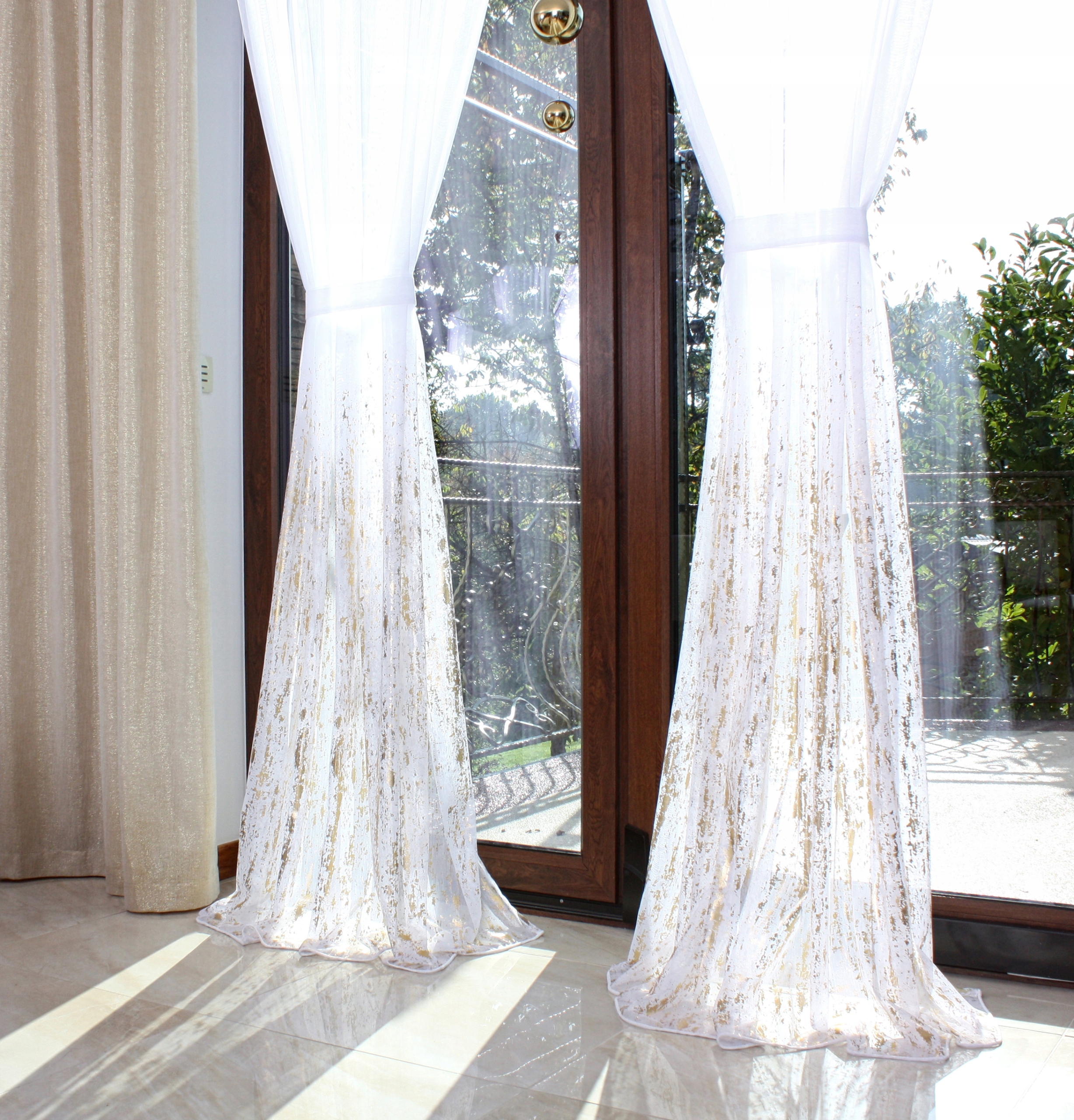 Белая штора очень нарядная, достаточно прозрачная. Золотой край, который кажется покрытым сусальным золотом. На высоте 120 см от низа занавески она начинает исчезать и создается впечатление, будто золото полетело вверх. Штора будет прекрасно смотреться как в гламурном, так и в классическом интерьере, где приветствуются золотые аксессуары.