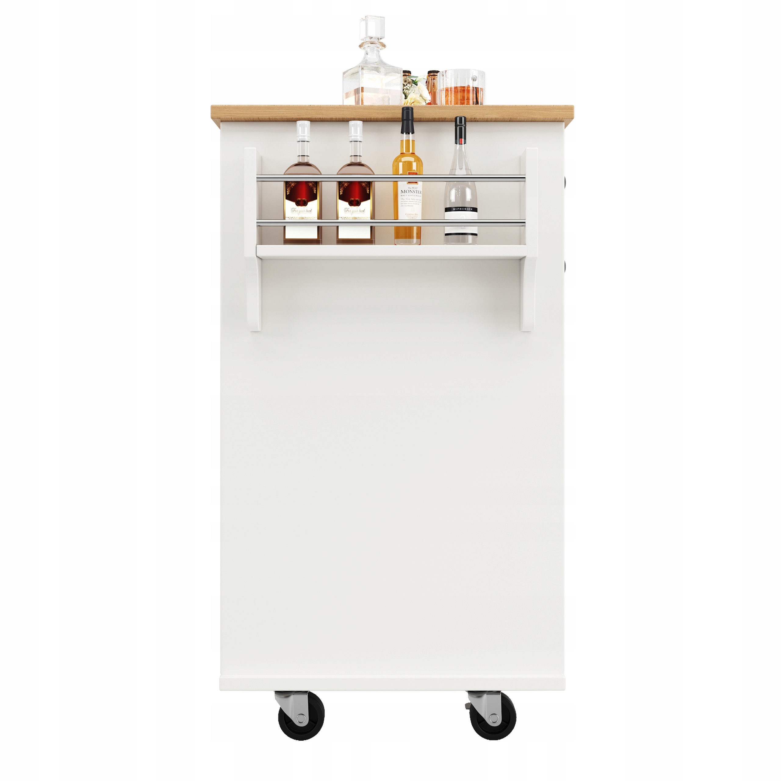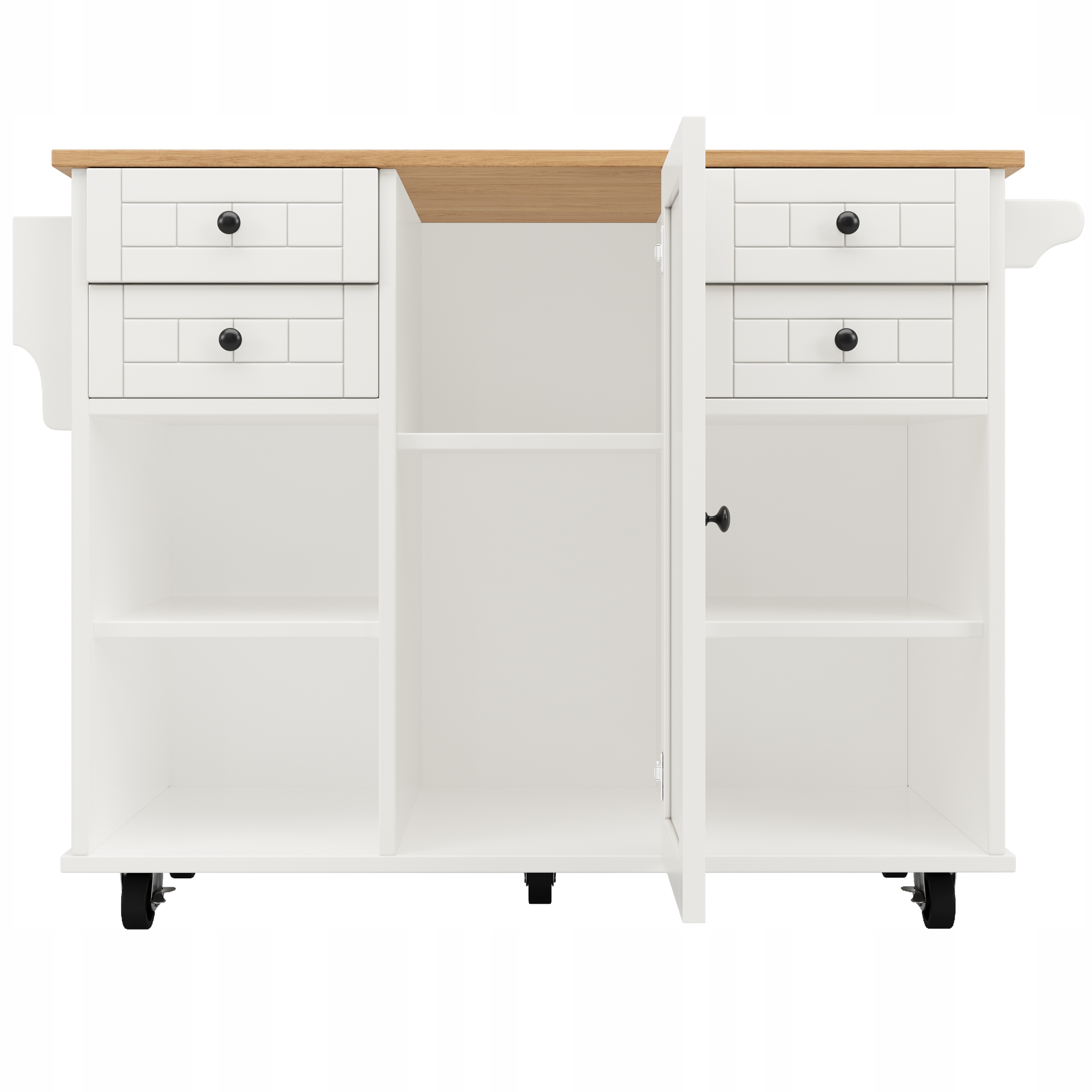 Боковые полки дополнительно увеличивают место для хранения, что позволяет хранить часто используемые предметы, такие как пищевая фольга, бумажные полотенца и бутылки специй, обеспечивая легкий доступ. Боковые полки стратегически расположены для поддержания эстетики острова, полностью использовать пространство и облегчить хранение. Подвеска для полотенец обеспечивает удобное место для полотенец, что позволяет высушить руки после приготовления или еды, сохраняя их чистыми и сухими, что увеличивает комфорт использования. В дополнение к хранению полотенец, вы также можете повесить на них небольшие аксессуары для очистки, увеличивая функциональность тележки.