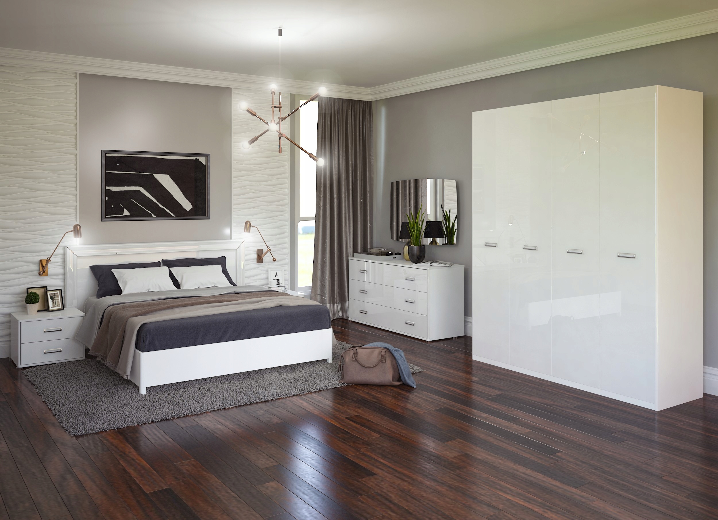 - Фасады: Зеркало + высококачественная ДСП 18 мм (глянцевая), покрытая трехслойным лаковым покрытием, просушенная УФ-лучами с использованием УФ-ламп. Что обеспечивает идеальную блестящую поверхность, которая не желтеет со временем.