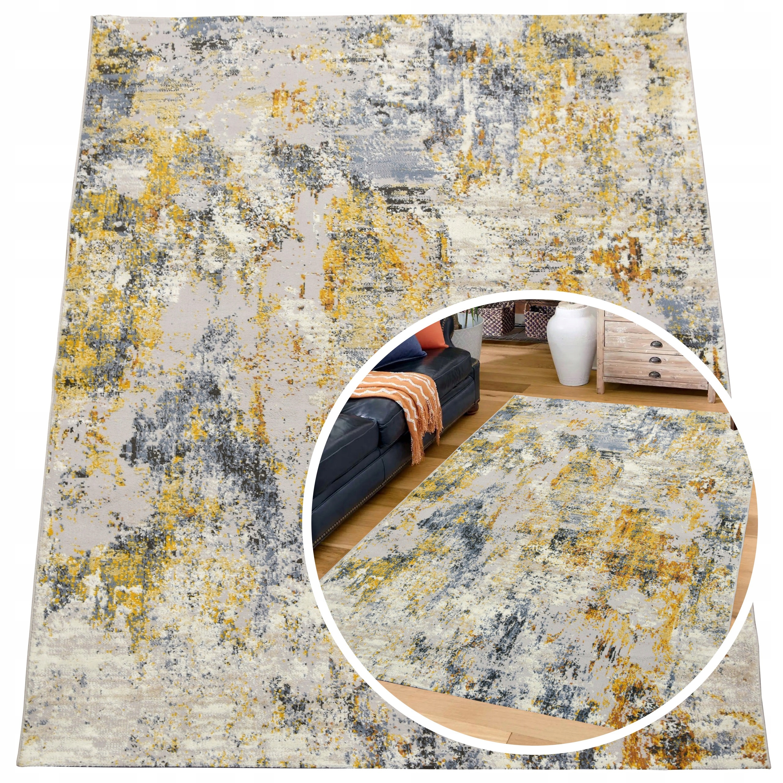 Абстрактный рисунок ковра прекрасно подчеркнет стиль и придаст характер вашей квартире. При этом, благодаря разнообразным цветовым тонам, преимущественно серому с добавлением оттенков желтого, синего и черного, ковер искусно: