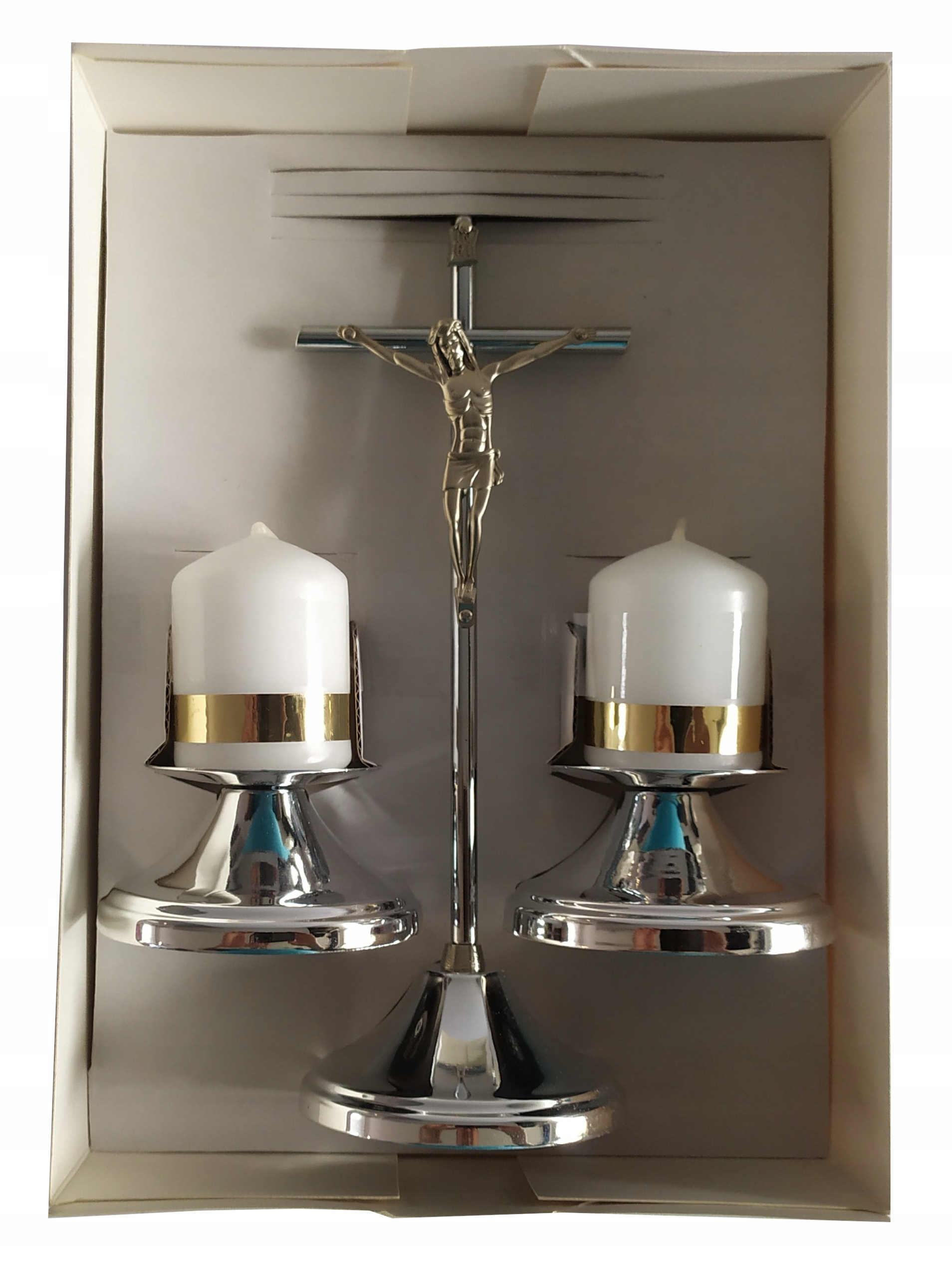 - ДВА ПОДСВЕЧНИКА СО СВЕЧАМИ (ВАЖНО, НА СВЕЧАХ МОЖЕТ НЕ БЫТЬ ЗОЛОТАЯ ПОЛОСКА, КАК НА ФОТО, ОНИ МОГУТ БЫТЬ ЦЕЛЬНО БЕЛЫЕ СВЕЧИ) 9 СМ ВЫСОТА И ШИРИНА ОСНОВАНИЯ 7 СМ, САМ ПОДСВЕЧНИК ВЫСОТА 3,8 СМ.