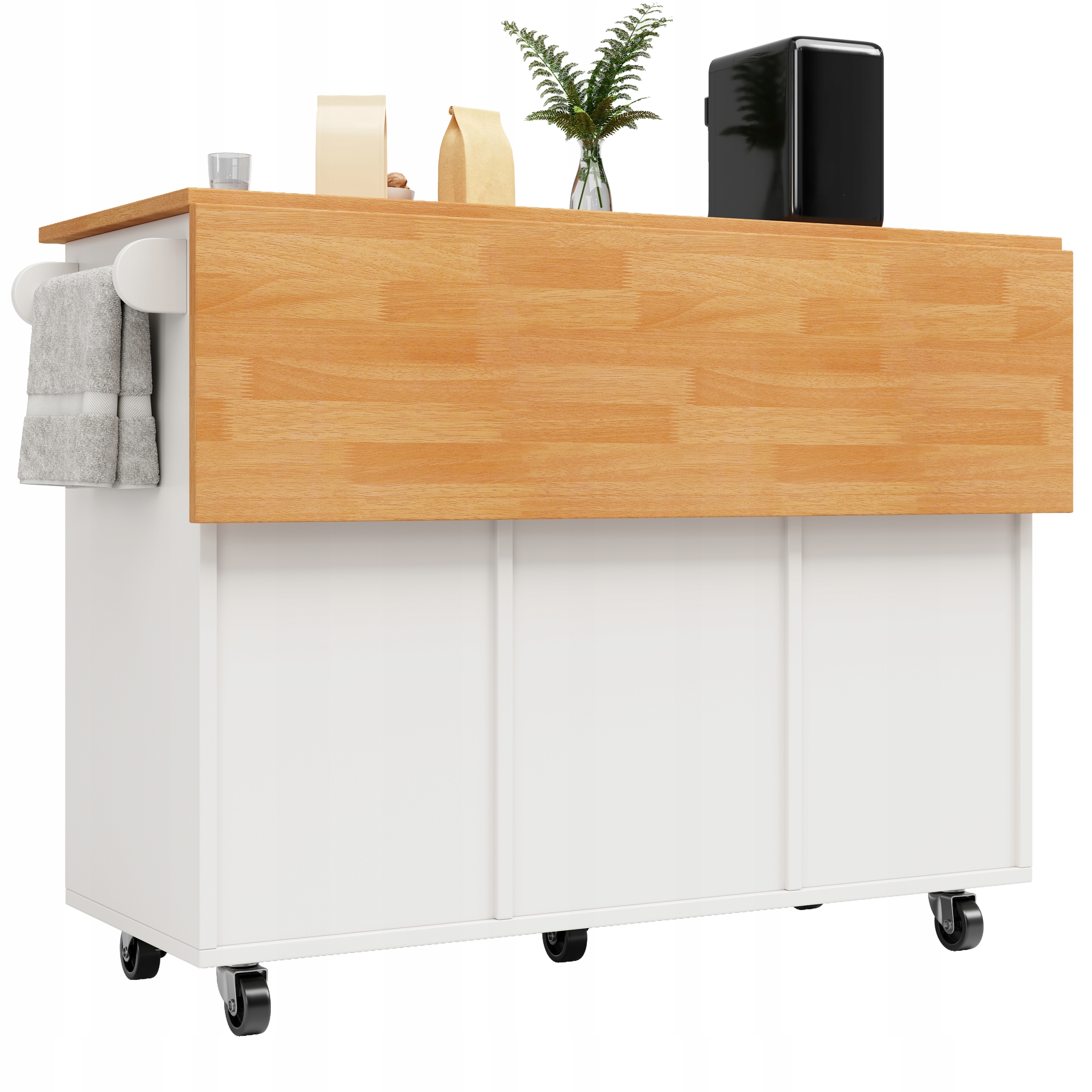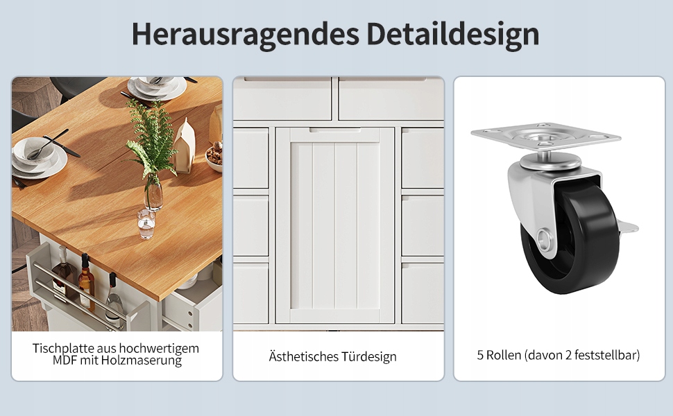 Замки и запорные колеса: Кухонная тележка оснащена прочными запорными колесами, которые позволяют легко передвигаться по кухне или столовой. Запирающий механизм обеспечивает устойчивость и безопасность острова во время использования, предотвращая случайное смещение или скольжение.
