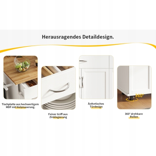 Высококачественный материал: верхний из высококачественного MDF (Fiberboard средней плотности) с отделкой, имитирующей древесину, является не только эстетическим, но также прочным и простым в чистке и обслуживании. Кухонный остров оснащен деликатными ручками цинк сплава, которые не только улучшают эстетику, но и обеспечивают комфорт и долговечность.
