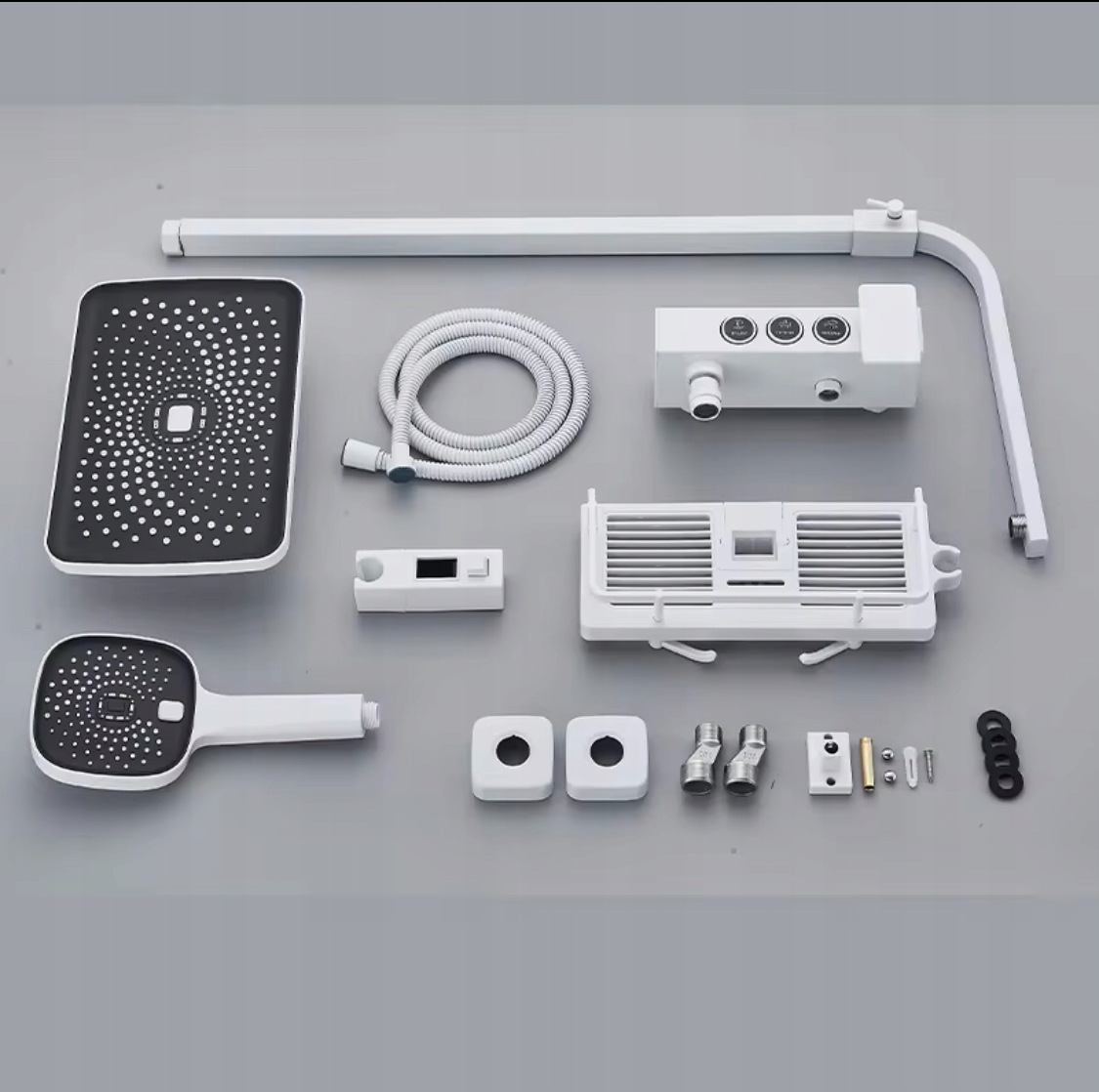 Стильный и современный душевой набор с тропическим душем, изливом, душевой трубкой и биде, а также белой полочкой