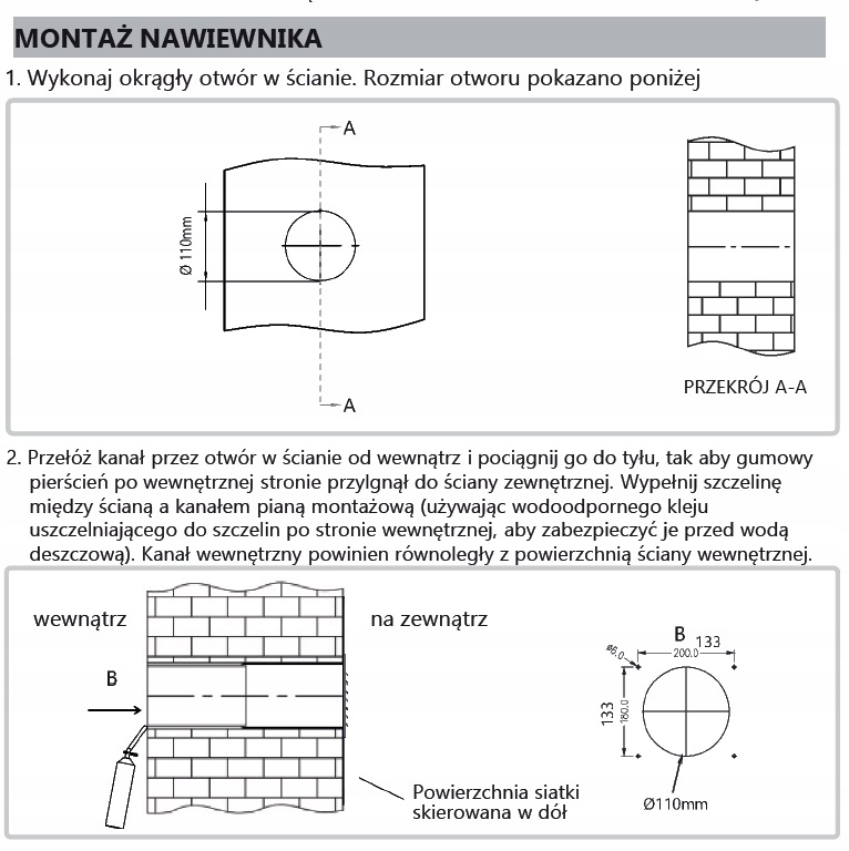 Вентиляционный колпак должен быть установлен снаружи стены, чтобы предотвратить попадание воды и других предметов в вентиляционное отверстие.
