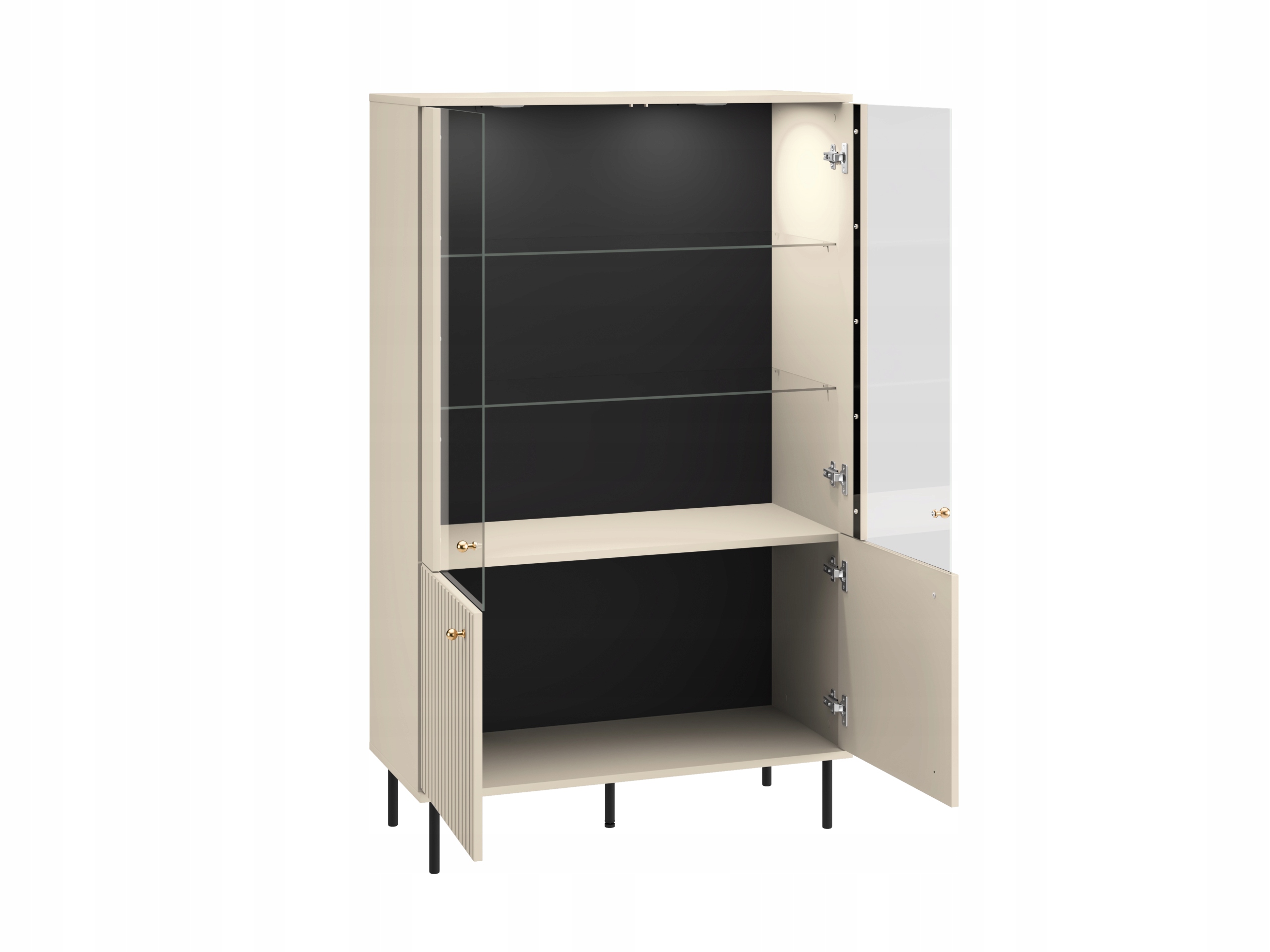 На сайте Софи 03, несомненно, привлекает ваше внимание с помощью своего дизайна. Тонкий кашемировый цвет, рев из фрезеров на фронтах и черные металлические ножки добавляют блок необычайной элегантности. На сайте вы найдете четыре закрытых помещения с полками, благодаря которому оно становится очень функциональным. Частично глазированный фронт позволяет отображать украшения или любимые сувениры. Высокие ноги помогут поддерживать порядок под блоком. Набор также включает в себя светодиодное освещение, которое позволит вам подчеркнуть объекты и добавить акцент в интерьер.