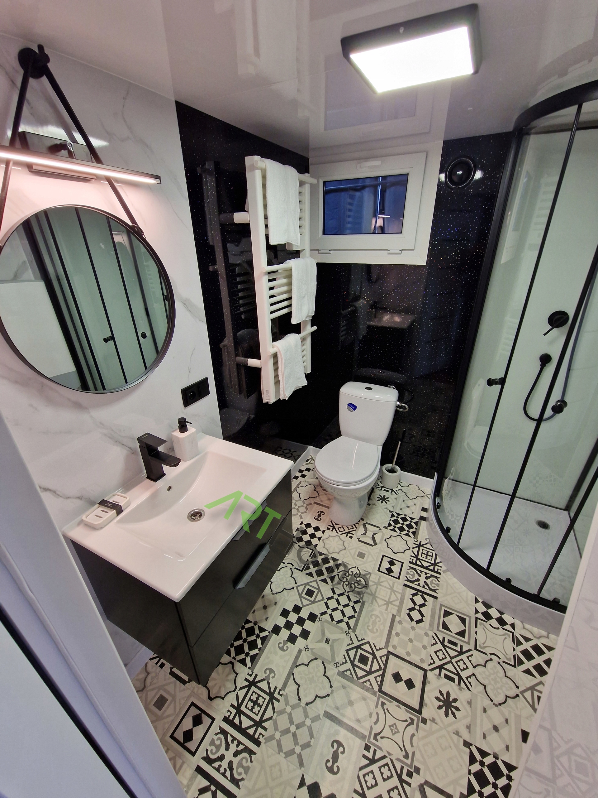 - Сантехническое оборудование (компактный унитаз, шкаф с умывальником, подсветка зеркала, душевая кабина, низкий душевой поддон, водонагреватель Velis Wi-Fi 50л)