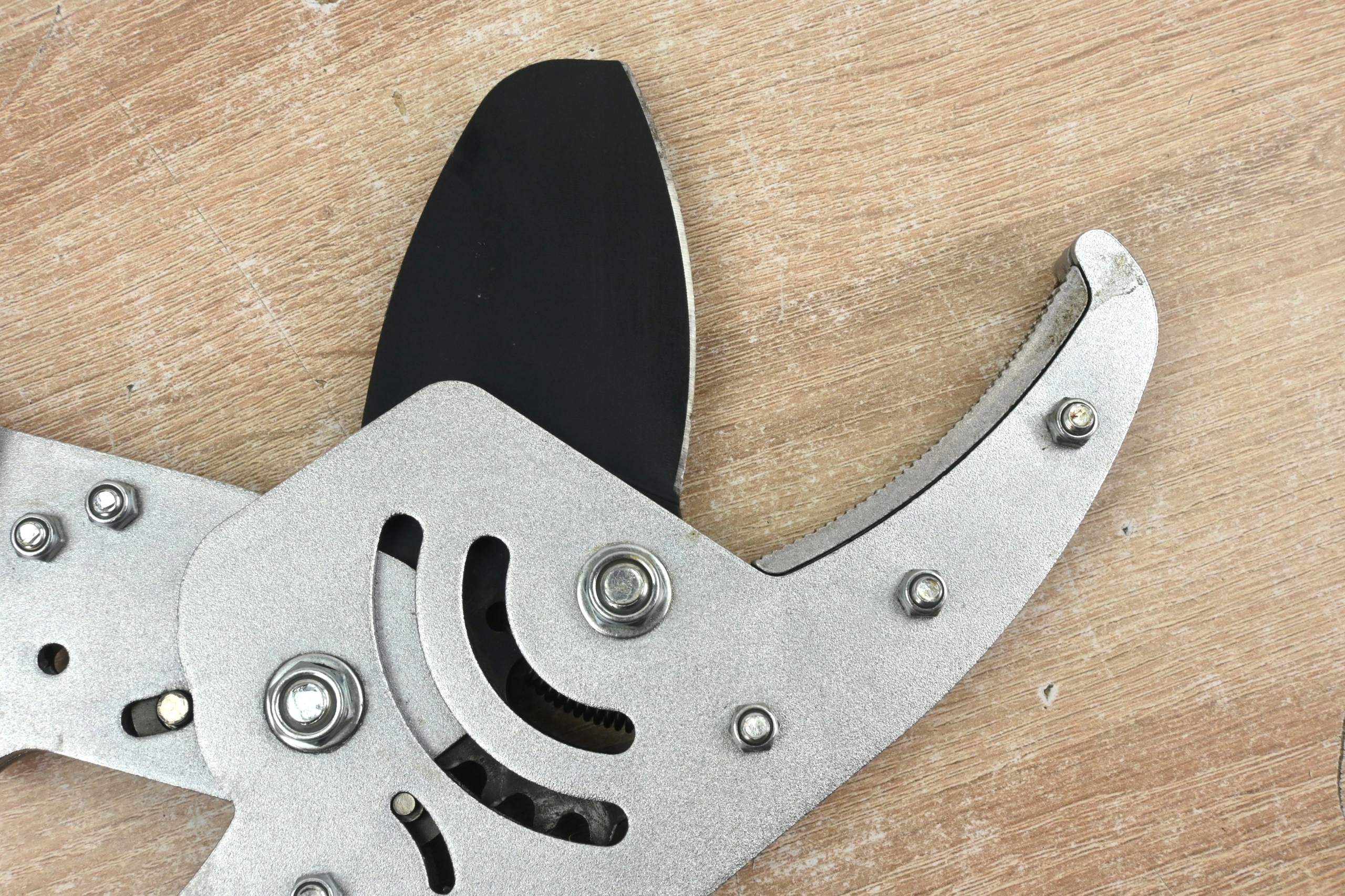 Лезвие изготовлено из высококачественной углеродистой стали SK5 и покрыто политетрафторэтиленовым (ПТФЭ) покрытием, которое обеспечивает защиту от коррозии и снижает трение. Телескопические ручки с регулируемой длиной от 71 до 103 см позволяют комфортно срезать как низкие над землей, так и более высокие ветки.