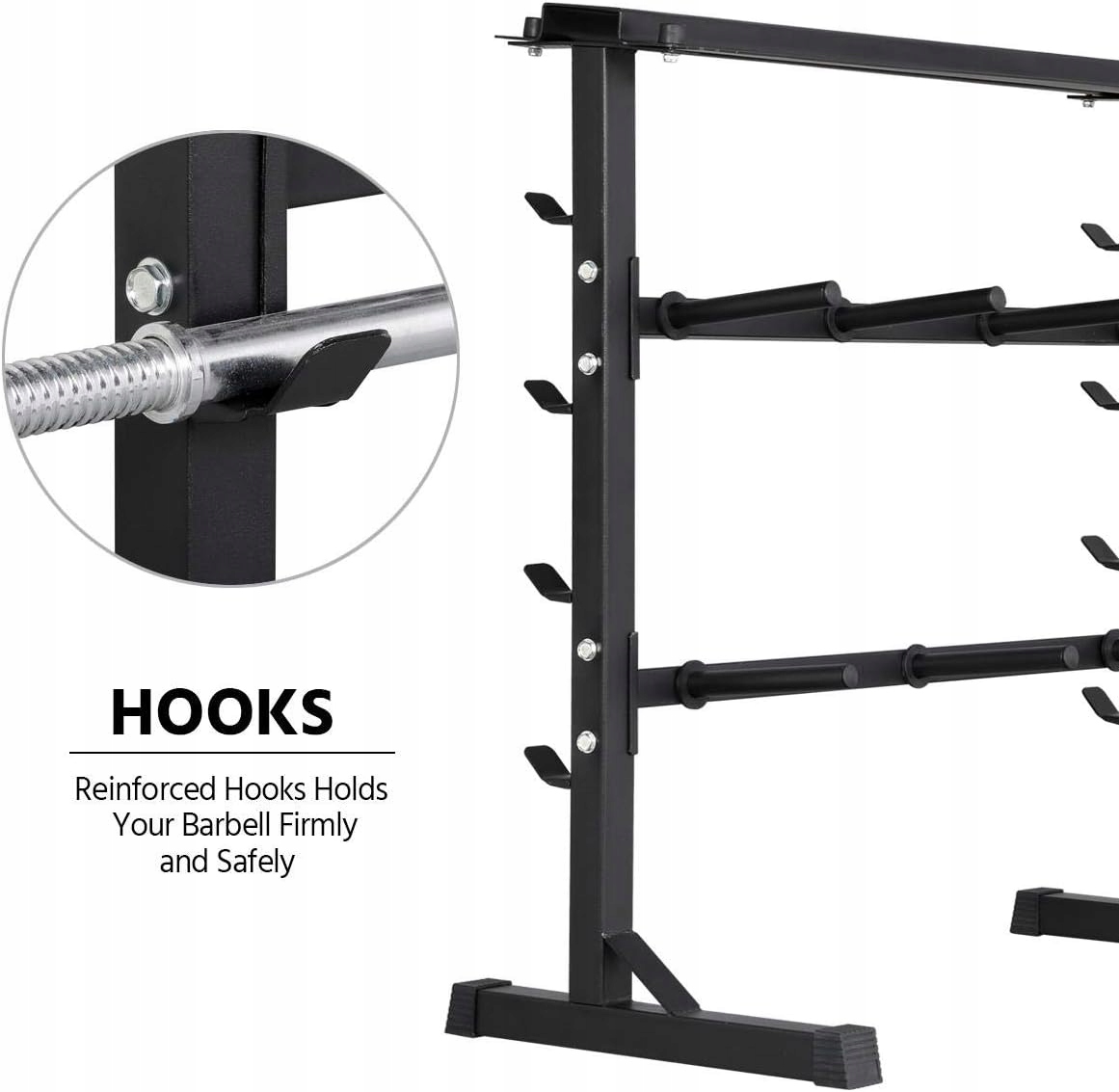 - Стойка для штанги с большим пространством - крючок для блинов для гантелей, полноценная верхняя полка для коротких гантелей, 4 длинные штанги.