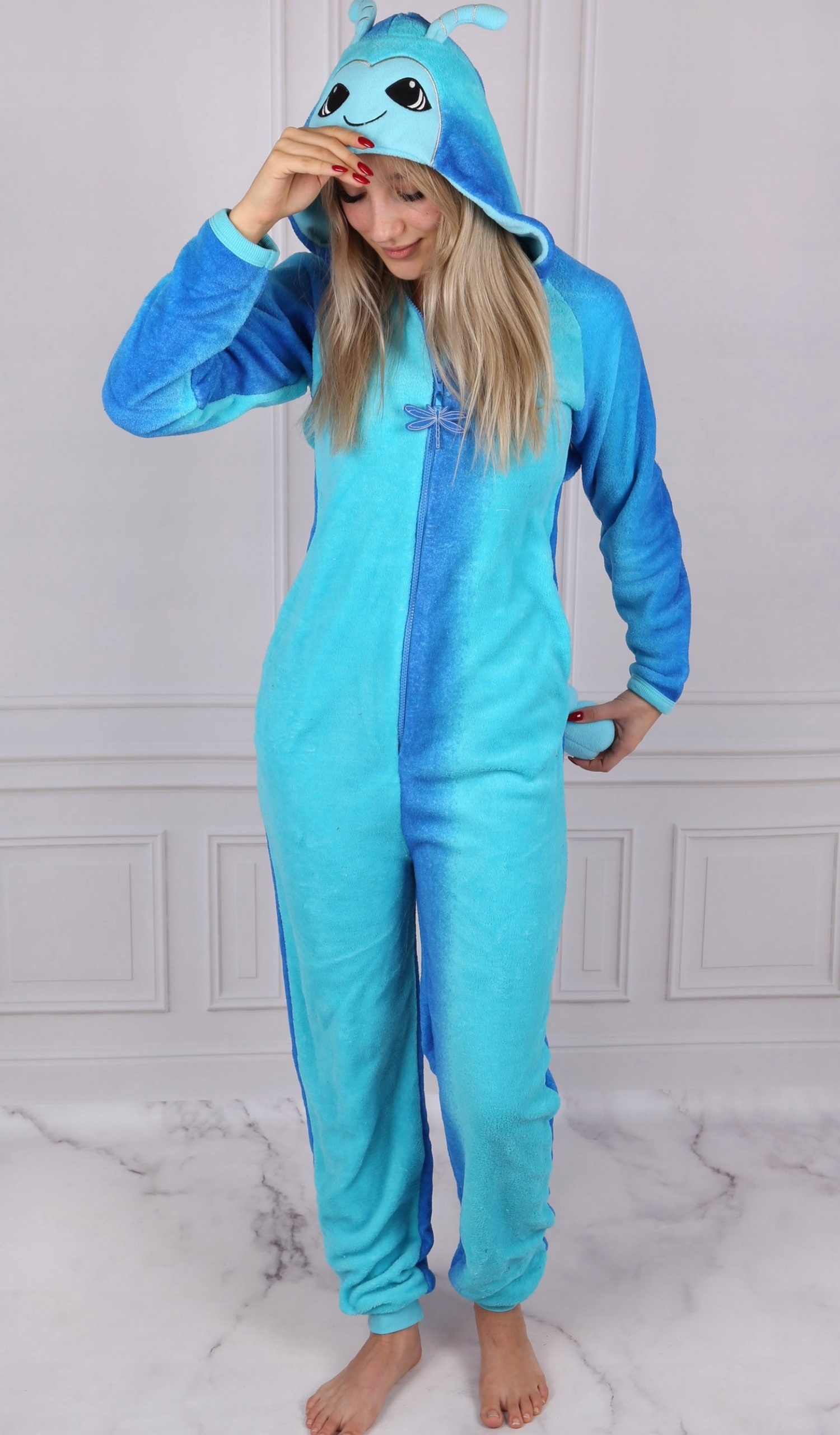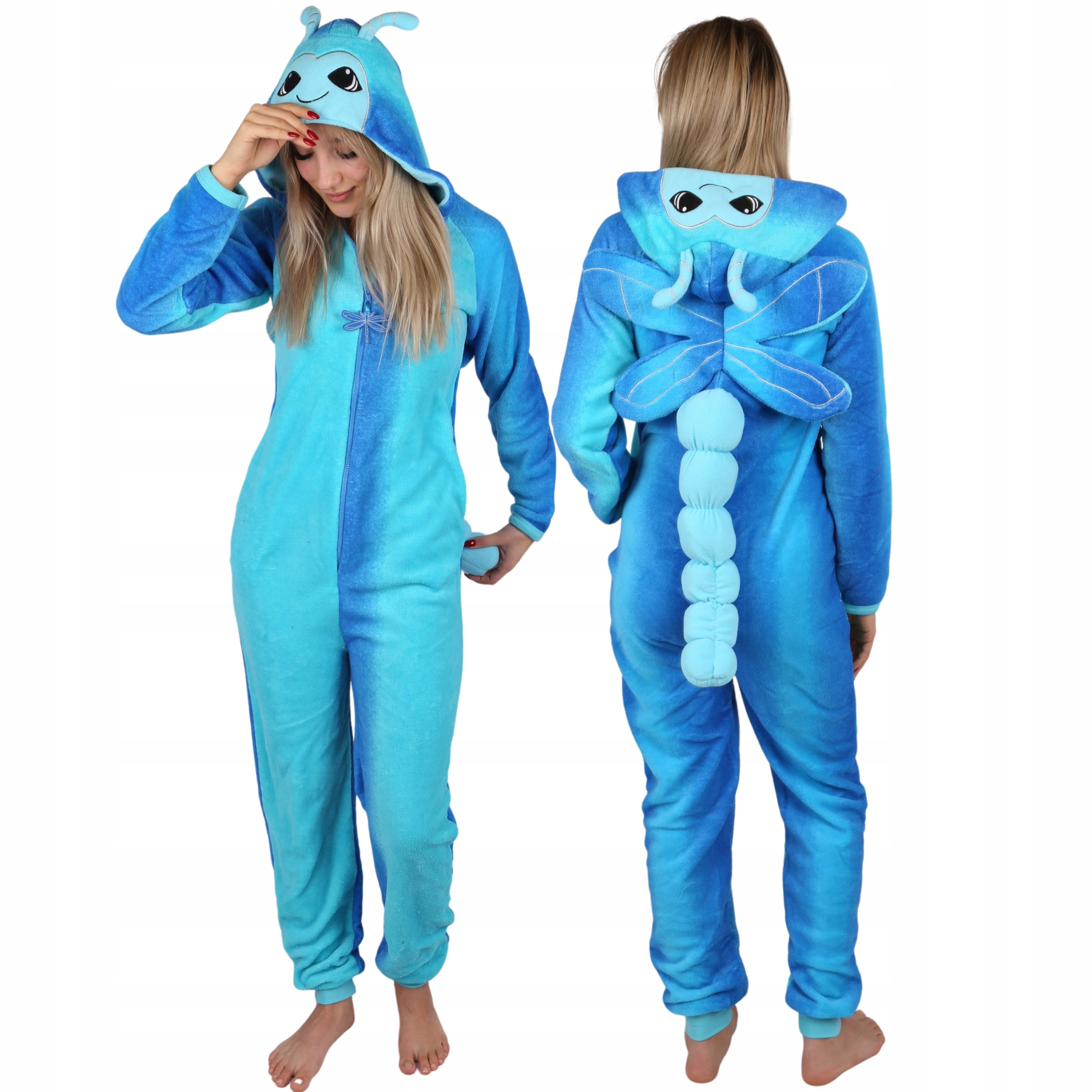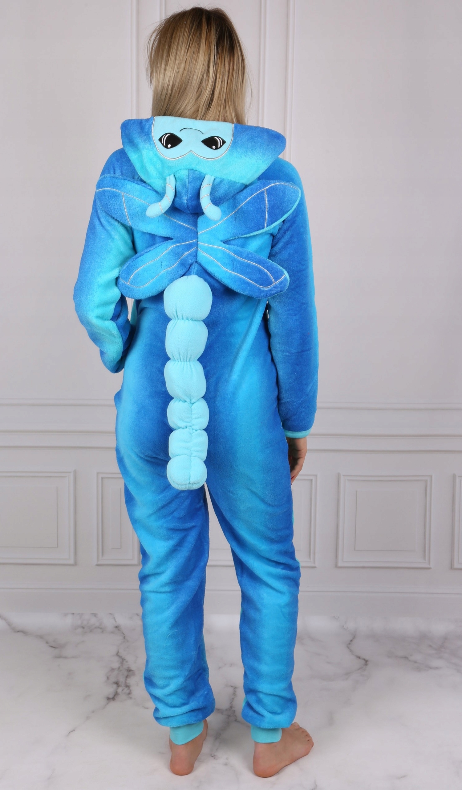 Синяя цельная пижама с капюшоном - стрекоза.