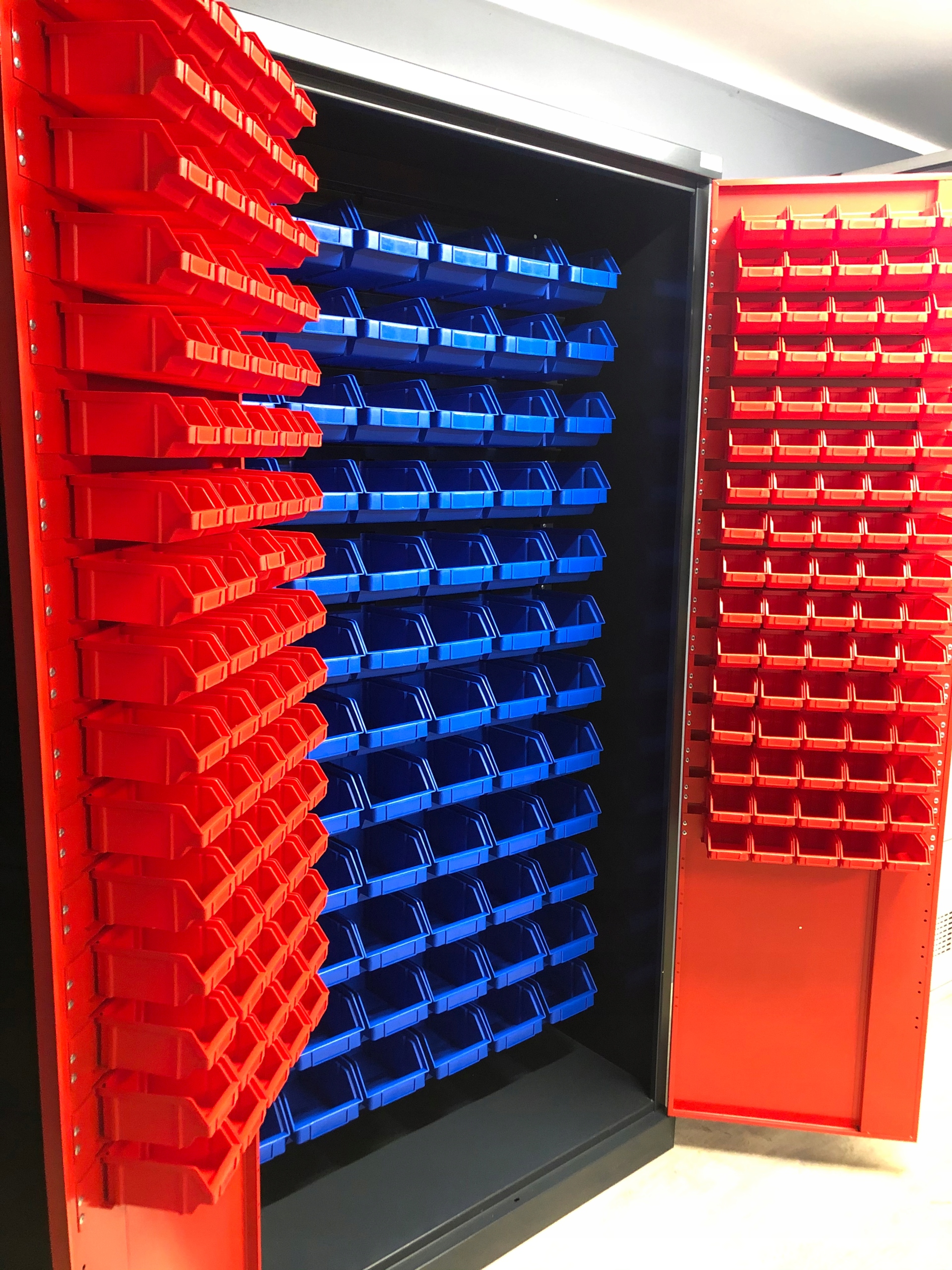 Все элементы гардероба изготовлены из стального листа толщиной 1,0 мм. Двери со скрытыми петлями. Дверная ручка с предохранителем с двухточечным запиранием. Шкаф оснащен планками для крепления инструментальных контейнеров размерами 108 х 144 х 224/170 мм (72 шт.) на задней стенке и размерами 56 х 77 х 119/90 мм (по 80 шт.) на дверце шкафа. Шкаф поставляется в контейнерах.