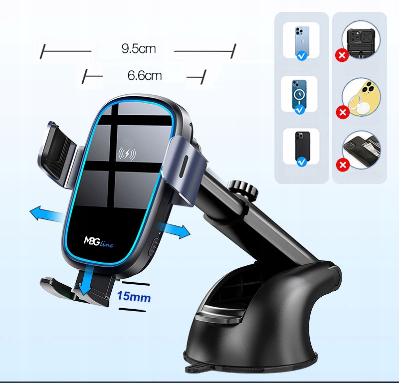 - Держатель/зарядное устройство подходит для всех телефонов шириной от 6,6 см до 9,5 см - зарядка будет работать только для телефонов с возможностью беспроводной зарядки.