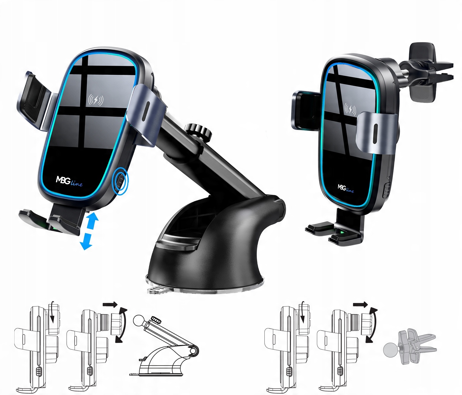 Автоматически открывающийся и закрывающийся держатель с синей светодиодной подсветкой вокруг держателя + дополнительный светодиод, указывающий на беспроводную зарядку!
