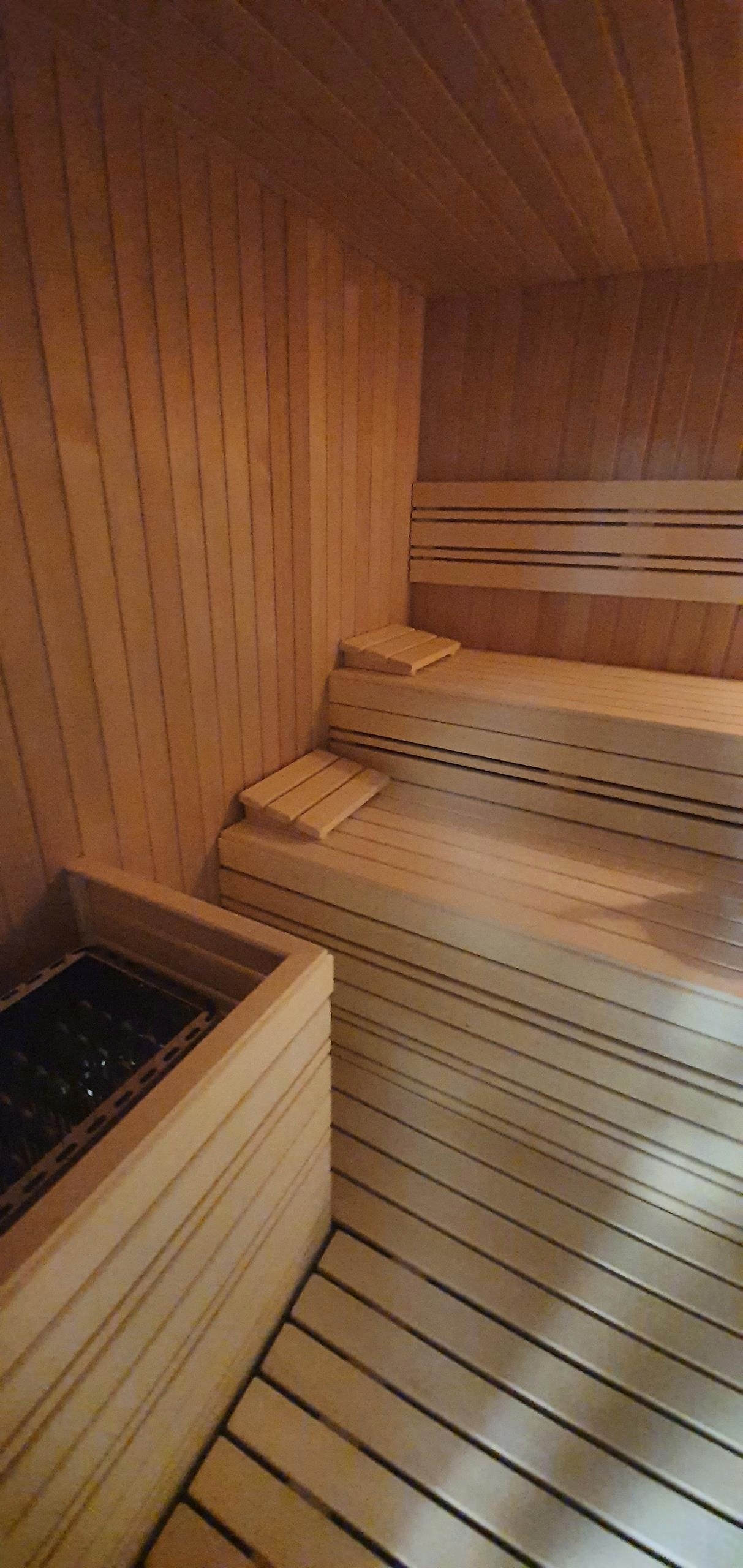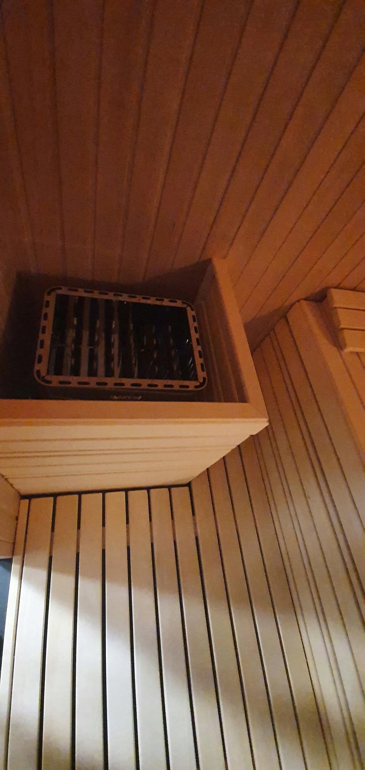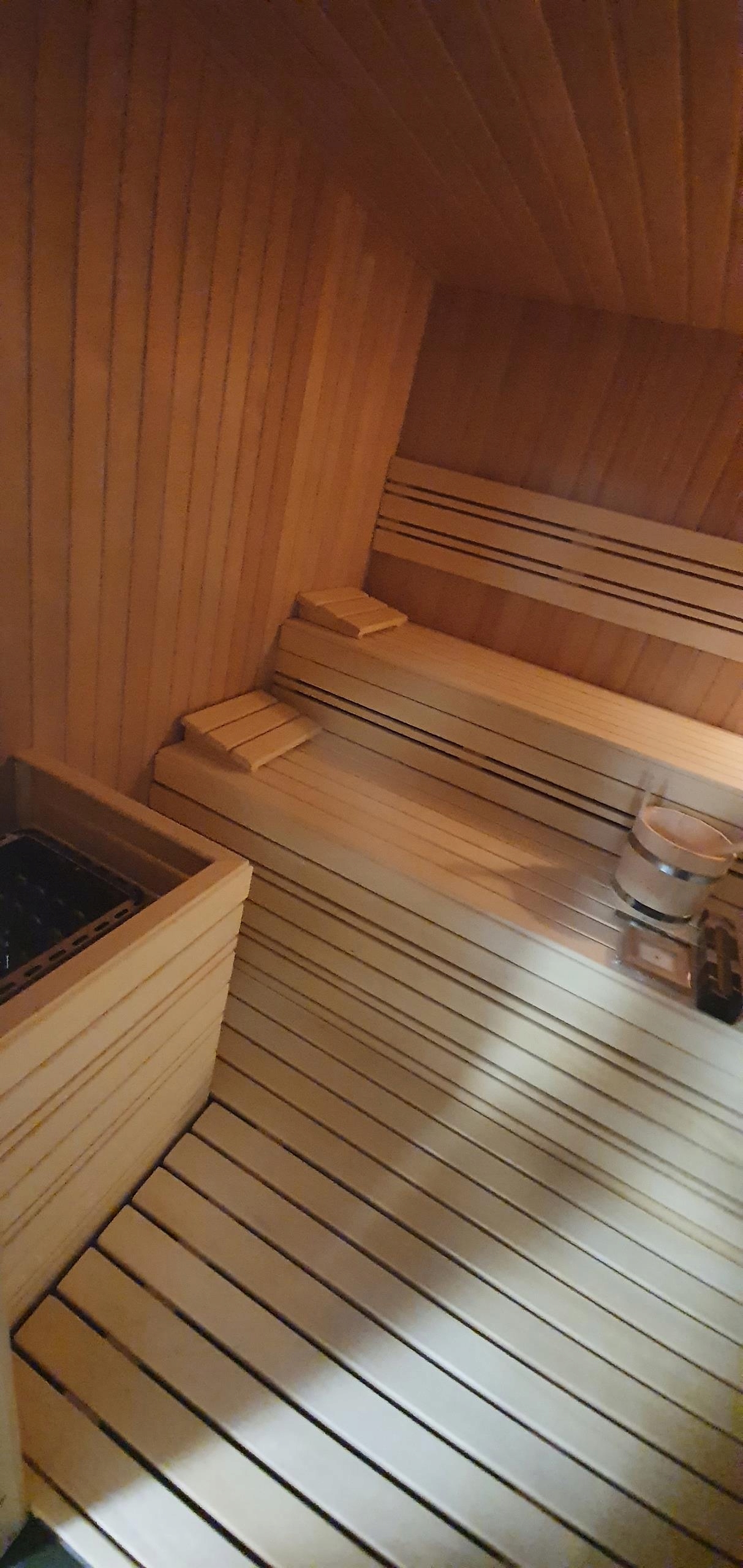 Сауна изготовлена из вагонки из канадской ели (болиголова) класса А толщиной 12,5 мм. Стены толщиной 65 мм, утеплены минеральной ватой 50 мм. Дверь цельностеклянная, без порога, тонировка коричневая. Скамейки, кожух печи, спинки, помост, подголовники изготовлены из ненагревающегося дерева абачи.