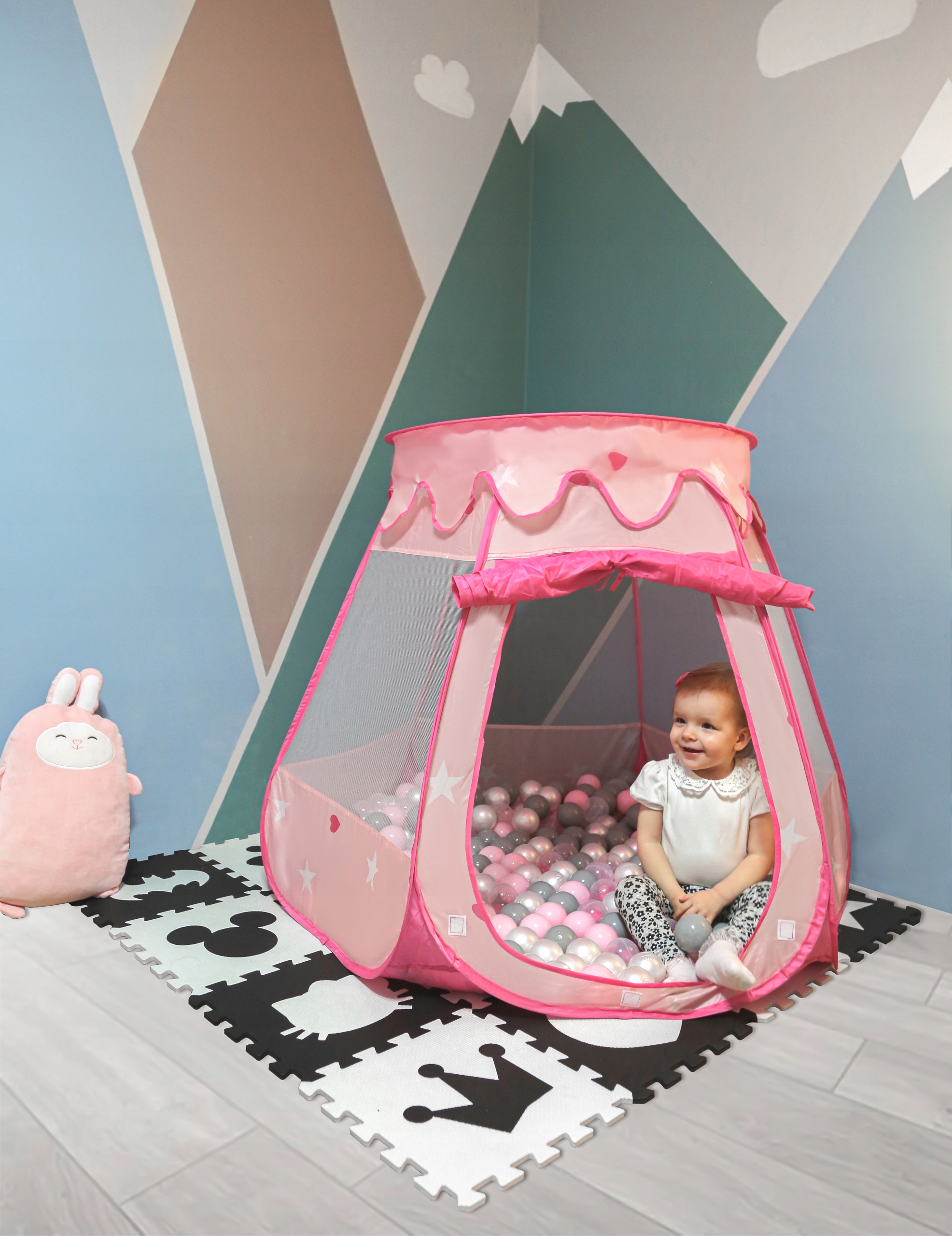 Набор В комплект входит : палатка/замок и 100 шариков следующих цветов: пудрово-розовый, жемчужный, прозрачный.