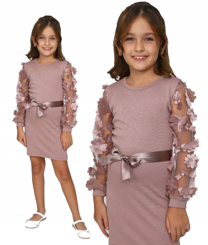 SUKIENKA ELEGANCKA WĄSKA PROSTA TIULOWE RĘKAWY KWIATY 3D róż 5/6 H107K