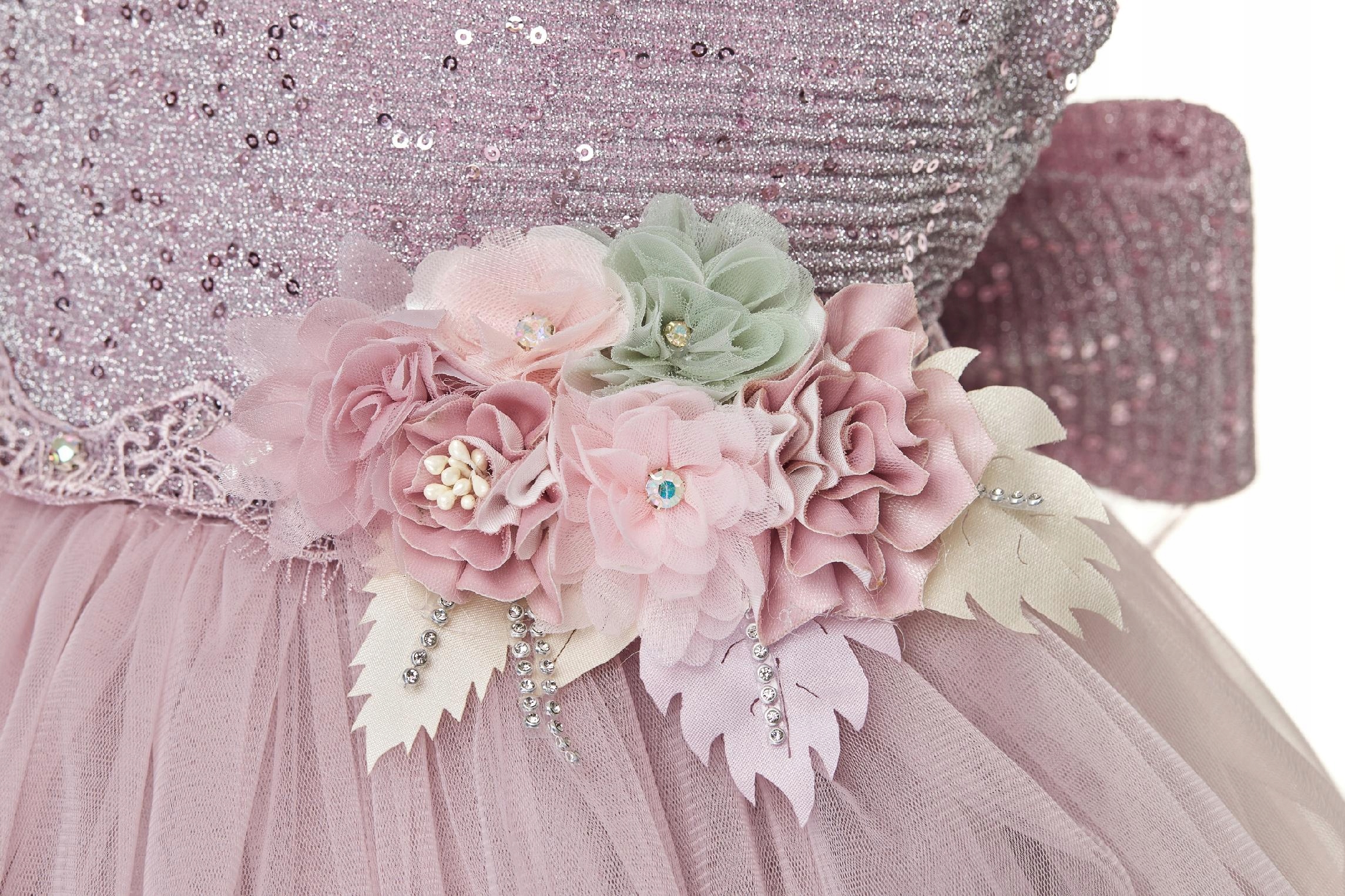 Асимметричное платье, красиво украшенное бисером, цветами и кристаллами