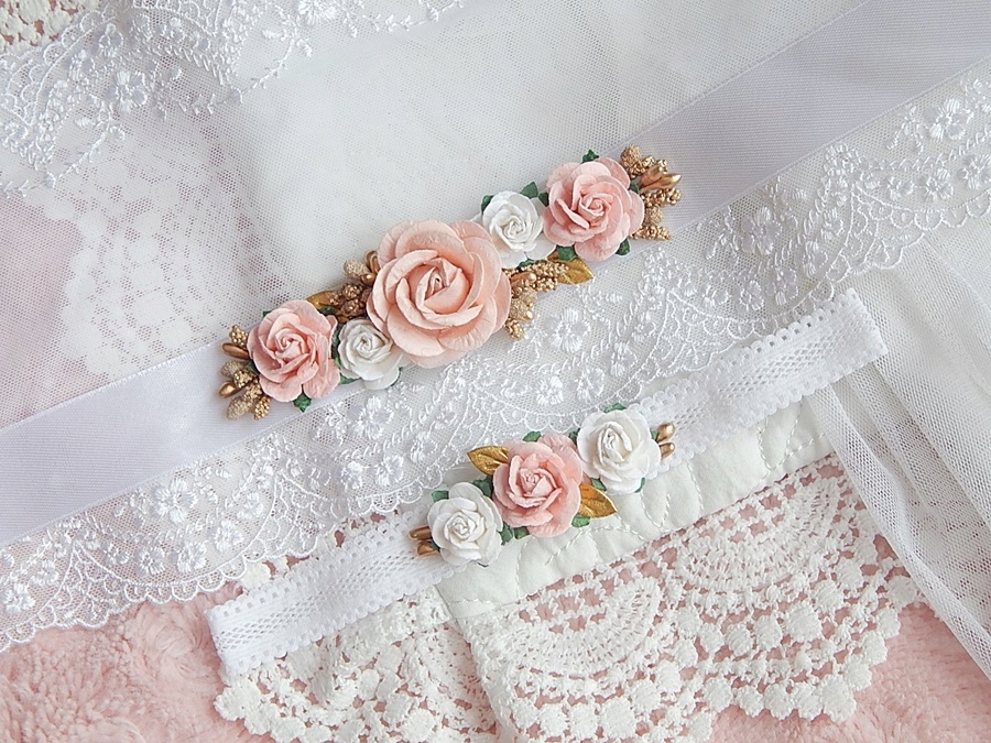 повязка на голову на декоративной белой эластичной, украшенной нежными цветами. Его схема в незаконном состоянии составляет около 36 см