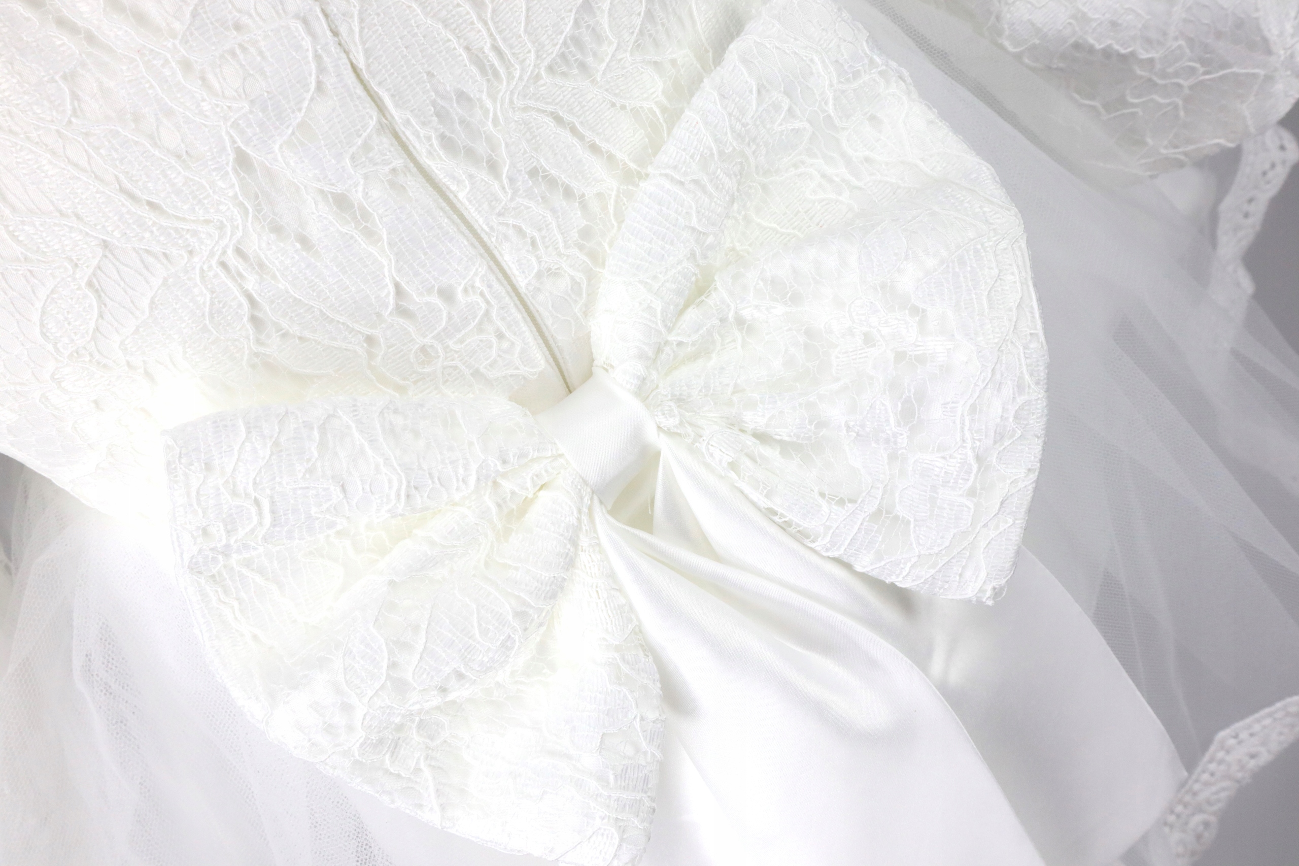 Белое элегантное платье для крещения или для другого особого случая. Вверху платья имеется кружевная часть, а низ выполнен из нескольких слоев нежного тюля и непрозрачной подкладки, что делает платье красиво расклешенным и очень эффектным. Спинка платья застегивается на молнию и украшена красивым большим бантом, который отстегивается, поэтому при необходимости его можно расстегнуть и снова пристегнуть. Платье имеет длинные рукава, поэтому идеально подходит для прохладных дней.