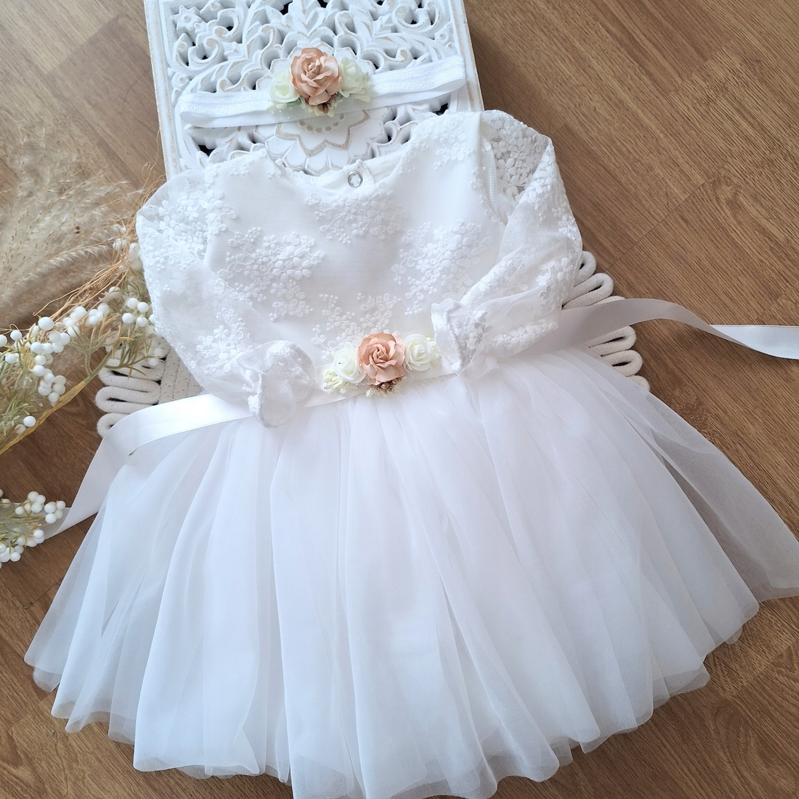 Сукня для хрещення з довгим рукавом, мереживо та фатин, колір екрю 80
