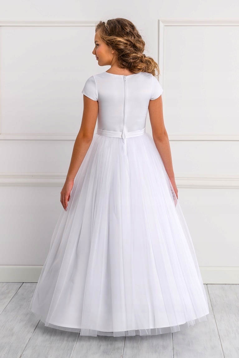Предлагаем красивое белое платье для причастия. Имеет тюлевой низ и гладкий верх из атласа. Внутри вшита нижняя юбка, благодаря которой платье прекрасно сидит по фигуре. Платье застегивается на молнию сзади, а талия завершается нежным атласным поясом с очаровательным бантиком.