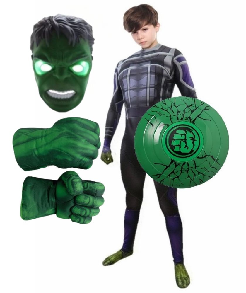 ОДНОРАЗОВАЯ КОЖАНАЯ МАСКА ХАЛКА КОСТЮМ МОНСТРА-МУТАНТА ДЛЯ КАРНАВАЛЬНОГО БАЛА 128 / 134 СМ (С ЭТИКЕТКОЙ 130) В КОМПЛЕКТЕ С МАСКОЙ, ЩИТОМ И ПЕРЧАТКАМИ