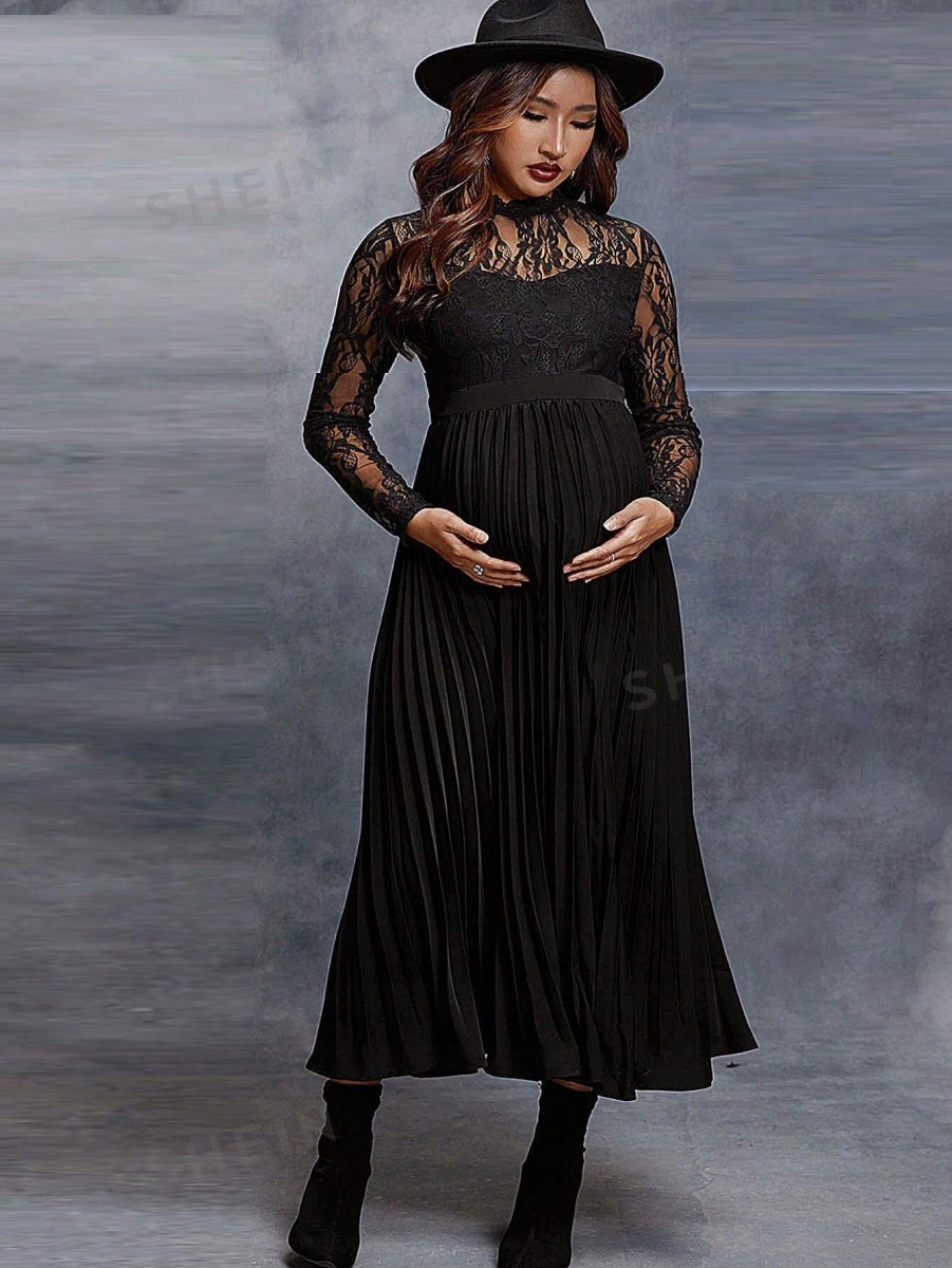 SHEIN ЧЕРНОЕ КРУЖЕВНОЕ ПЛАТЬЕ МИДИ С ПЛИССАМИ для беременных, M
