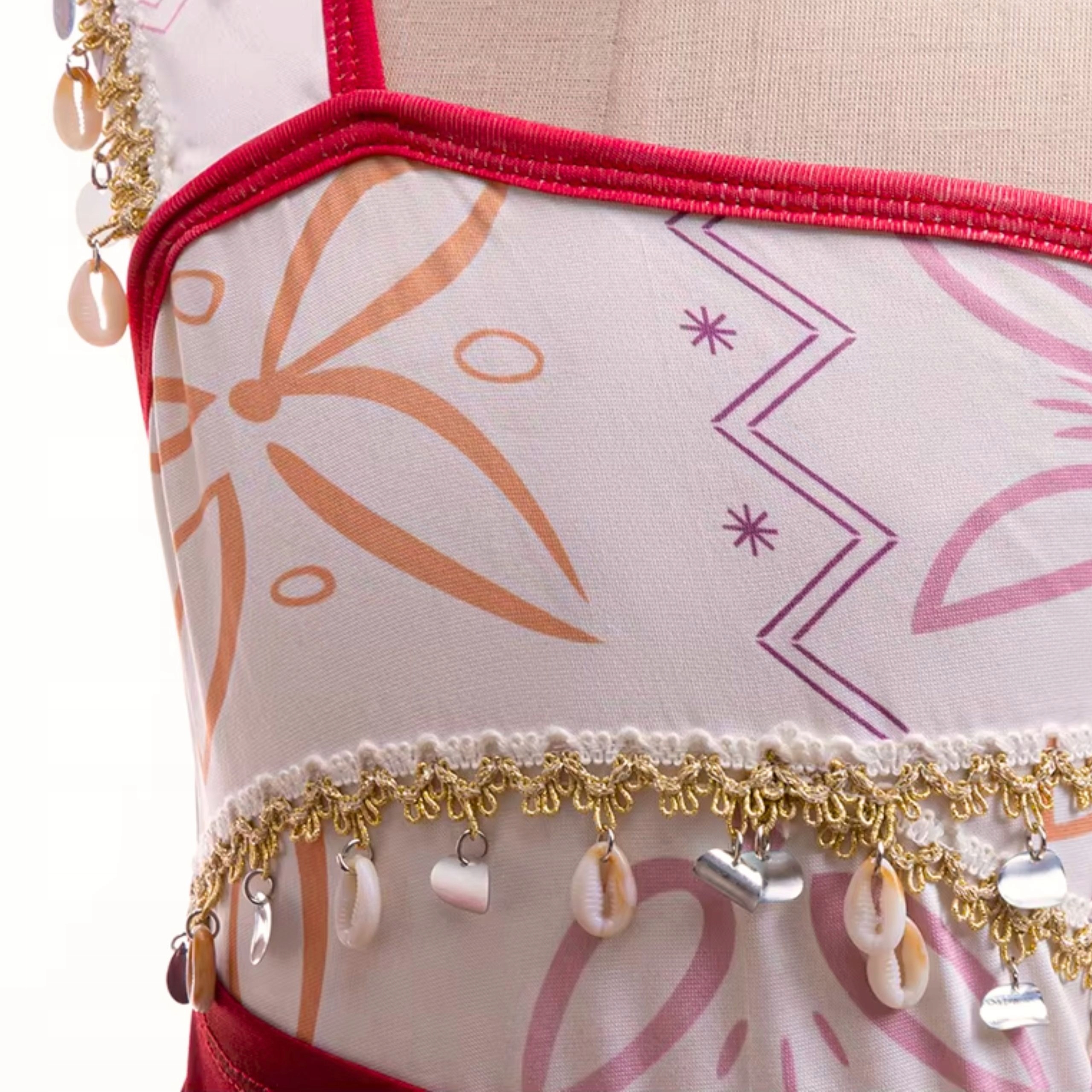 - Платье декорировано ракушками и небольшими пластинками – блестящие, привлекающие внимание детали